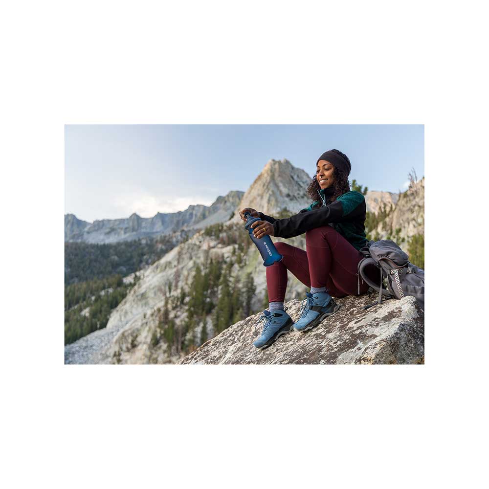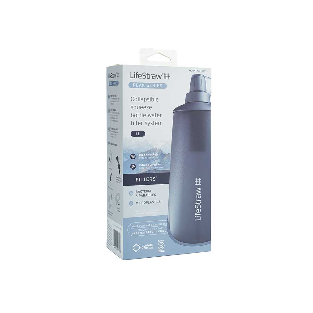 - Zestaw zawiera: filtr LifeStraw Peak, składaną butelkę o pojemności 1 L, strzykawkę do płukania wstecznego