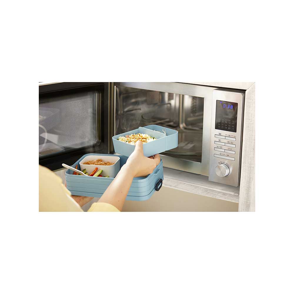 Ten lunchbox w szczególności przypadnie do gustu osobom lubiącym zdrowy tryb życia oraz wszystkim rodzicom przygotowującym posiłki dla dzieci do szkoły czy na wycieczki. Zdrowe i smaczne potrawy przygotowywane w domu i spożywane w pracy, czy też na łonie natury, to nie tylko sposób na dobre samopoczucie, ale również element stylu życia zgodny z aktualnymi trendami bycia fit. Lunchbox jest bardzo pojemny - 1500ml. W środku dodatkowo są dwa wyjmowane wkłady, jeden - w formie zamykanego pudełeczka doskonały na sos, zupę krem lub pastę o pojemności 300 ml, drugi - przedzielony na dwie części pozwoli na odseparowanie sałatek lub przekąsek czy też owoców. W zestawie jest również mały widelczyk. Dodatkowo, w pokrywie zamykającej całość znajduje się uszczelka, dzięki której przechowywane produkty zachowają swoją świeżość przez dłuższy czas. Produkt całkowicie neutralny dla przygotowywanej żywności, bezpieczny dla zdrowia - materiały z których jest wykonany nie zawierają toksycznych związków, nie pochłania zapachów. Lunchbox jest bardzo łatwy w czyszczeniu, przystosowany dla zmywarek. Wszystkie produkty Mepal wolne są od BPA oraz wykonane z materiałów nieszkodliwych dla zdrowia. Wyprodukowano w Holandii.