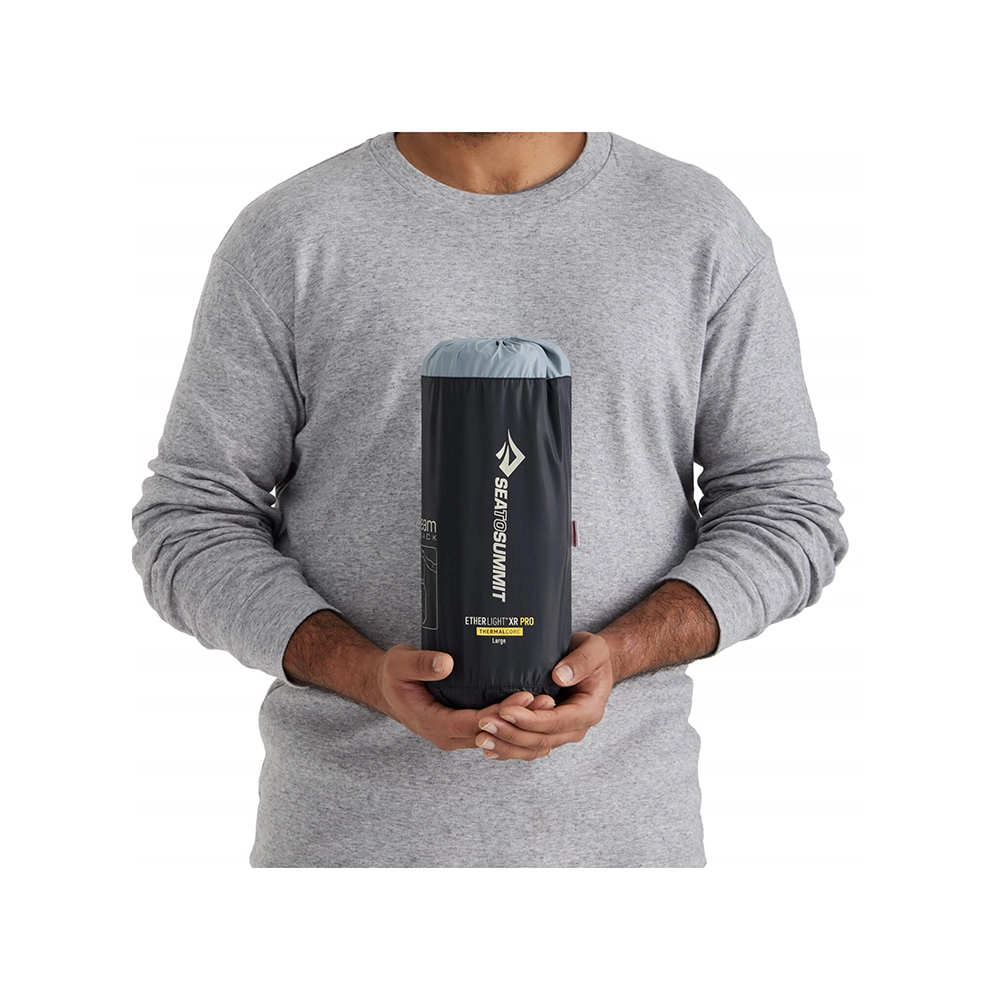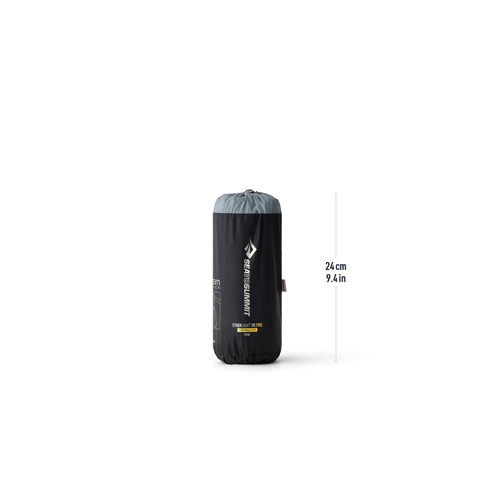 Zastosowano tu system Air Sprung Cells™, który polega na połączeniu ze sobą licznych komór powietrznych, dopasowujących się do kształtu ciała, zapewniając poczucie miękkości i komfortu. W materacu Ether Light XR Pro Insulated kieszenie powietrzne są większe niż w pozostałych dzięki czemu materac zyskuje na wysokości, co przekłada się na możliwość większego dociążenia punktowego bez dotykania podłoża np. w przypadku snu na boku. Grubość 10 cm pozwala na głębsze „zanurzenie” się i lepszy sen. Materac jest wykonany z Nylonu 30/40D oraz termoplastycznego poliuretanu (TPU). Dodatkowo ten model został wzbogacony o wielowarstwową powłokę THERMALCORE. THERMALCORE to technologia która ma za zadanie odbijać straty cieplne z powrotem do użytkownika. Materac wyposażony jest również w wielofunkcyjny wentyl, który ma za zadanie maksymalnie ułatwić składanie i rozkładanie materaca. Szeroki wentyl zapewnia jednokierunkowy przepływ powietrza, zapobiegając rozszczelnieniu zaworu oraz pozwala na szybkie napompowanie materaca. Aby zapewnić niczym nie zakłócony sen materac posiada mocowanie PillowLock, dzięki któremu za pomocą dołączonych naklejek można przymocować poduszki Sea To Summit co zapobiega ich przemieszczaniu. Zestaw zawiera także specjalny pokrowiec do przechowywania materaca który może jednocześnie służyć jako worek do pompowania. Produkt jest dedykowany do użytku zimowego lub wysokogórskiego. Wersja Large jest dłuższa i szersza dla większego komfortu.