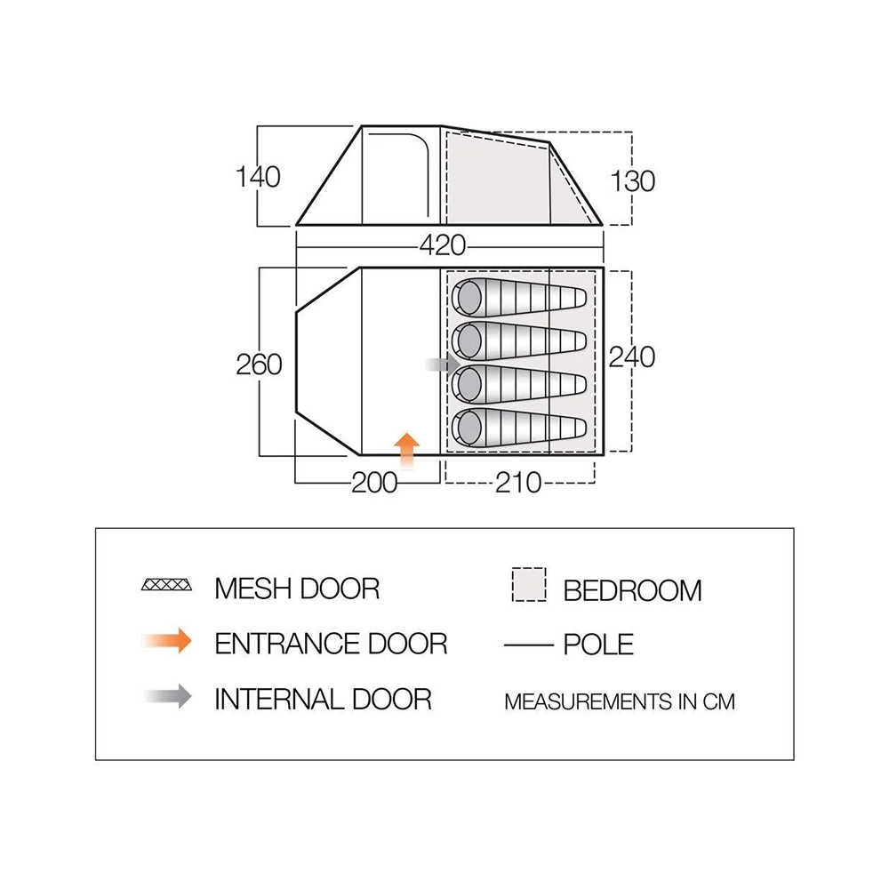Vango Skye 400 to przestronny namiot o konstrukcji tunelowej idealny dla małej rodziny lub grupy przyjaciół.