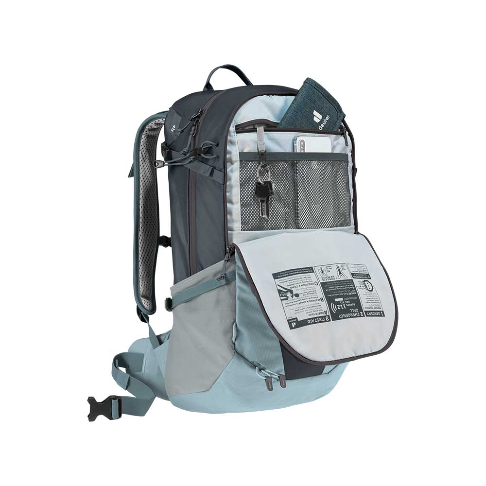 Wyposażono go w nowoczesny system nośny Aircomfort Sensic System, którego największym atutem jest wytrzymała siatka naciągnięta na dwa pręty. Dzięki takiemu rozwiązaniu między plecakiem a plecami użytkownika powstaje przestrzeń na wentylację. System nośny Aircomfort Sensic stał się połączeniem najwyższego poziomu wentylacji, ergonomicznego dopasowania oraz niskiej wagi. Boczne uchwyty umożliwiają dopięcie kijów lub czekana. Chowany pokrowiec przeciwdeszczowy zabezpieczy go w razie pogorszenia się warunków pogodowych. Główna komora, w przeciwieństwie do większych plecaków zamykana jest na zamek. Wewnątrz przedzielona jest za pomocą ściągacza na dwie części. Z przodu plecak wyposażono w wygodną dużą kieszeń z organizerem. Całkowicie na froncie znajduje się kieszeń wykonana z elastycznej siatki. Z obu stron plecaka znajdują się elastyczne kieszenie z siatki idealne do transportu butelek. Wyposażono go również z troki ściągające dzięki czemu możemy zmniejszyć pojemność plecaka a tym samym zabezpieczyć ładunek przed przemieszczaniem się wewnątrz. Na froncie znajdują się pętle do mocowania uchwytu na kask (uchwyt/siatka nie jest w zestawie). Kompatybilność z systemami nawodnienia daje możliwość zastosowania bukłaków o pojemności do 3 L.