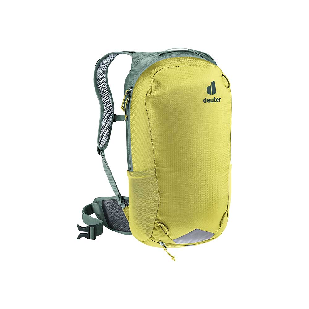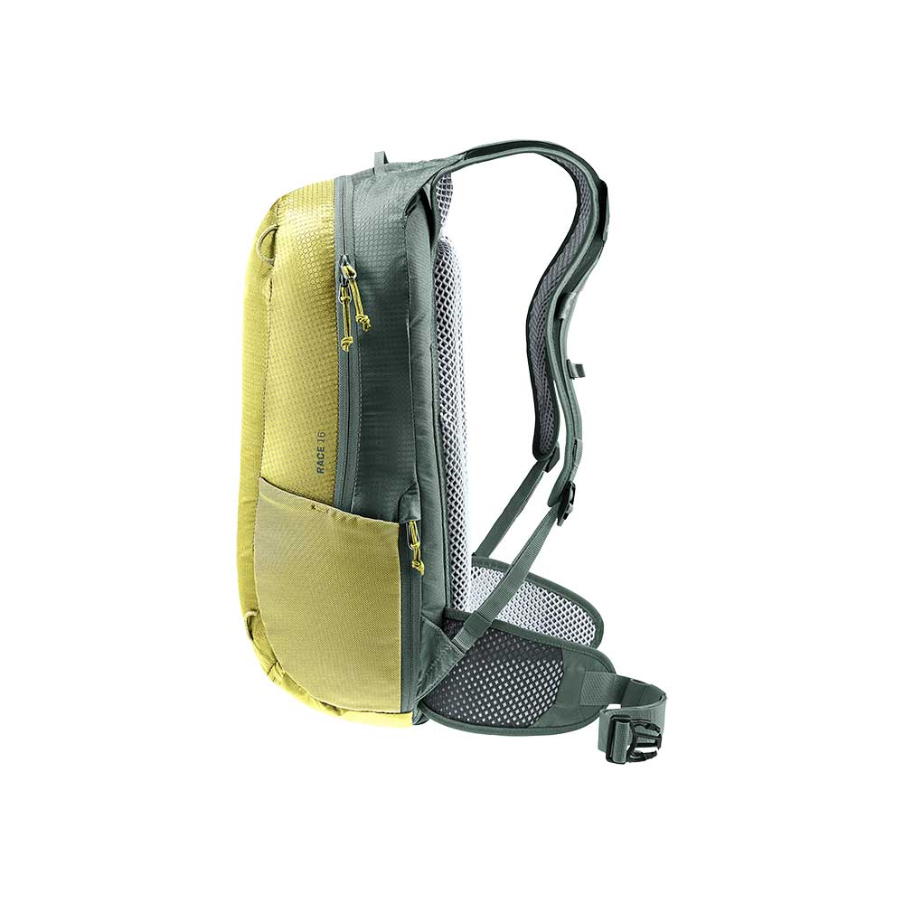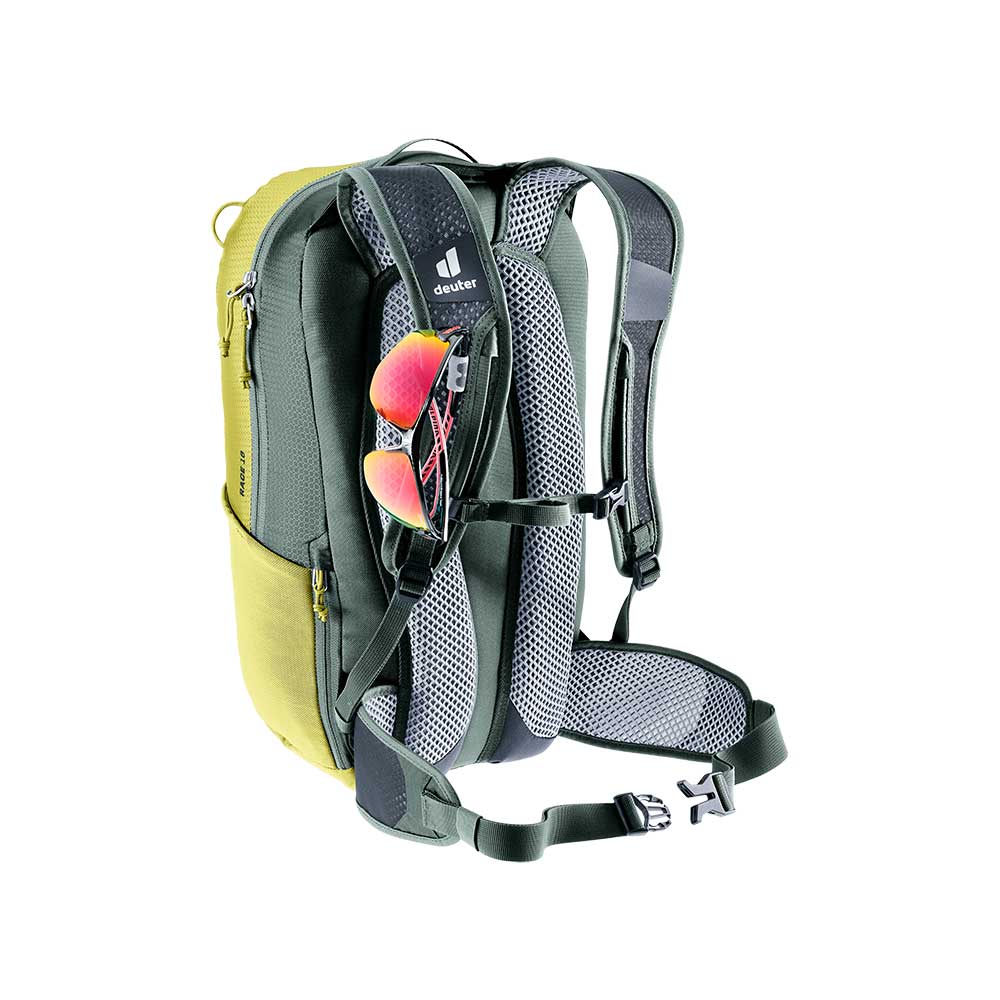 Deuter Race 16 to ulubiony model rowerzystów. Jego wszechstronne przeznaczenie wynika z bardzo niskiej wagi i kształtu, który nie krępuje ruchów. Wykonanie pasów nośnych i biodrowego z doskonale oprowadzającej gorące powietrze siatki pozwala na utrzymanie optymalnego klimatu skóry w czasie upałów. Plecak wyposażono również w pokrowiec przeciwdeszczowy - w kolorze żółtym. Jest on chowany w małej kieszeni na dole plecaka. Wysoką funkcjonalność Deuter Race 16 zawdzięcza wielu kieszonką. W komorze głównej znajduje się przegroda na bukłak oraz siatkowa kieszeń z zamkiem oraz uchwytem na klucze. Po obu stronach plecaka znajdują się elastyczne siatkowe kieszenie idealne na batony energetyczne. Na froncie znajdują się również uchwyty do mocowania siatki na kask (siatka nie jest częścią wyposażenia). Z jednej strony z boku znajduje się kieszeń zapinana na suwak, idealne miejsce na telefon komórkowy.