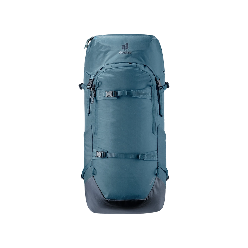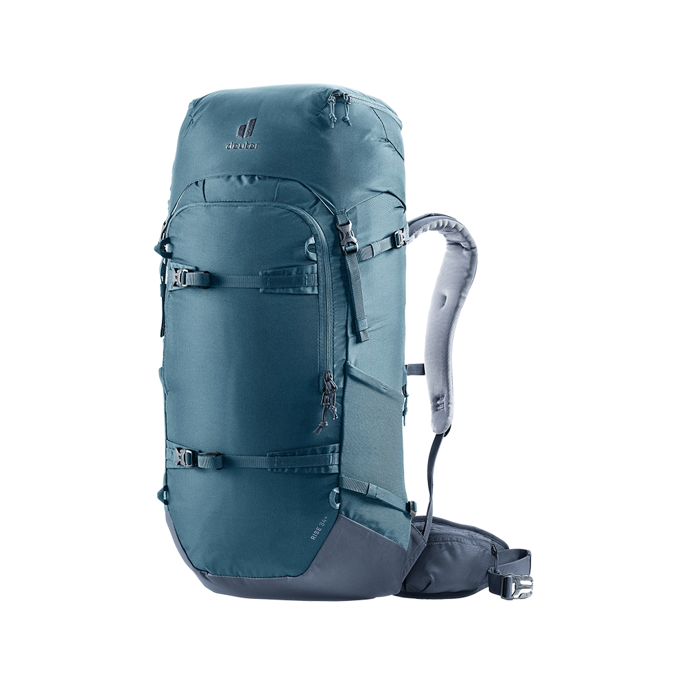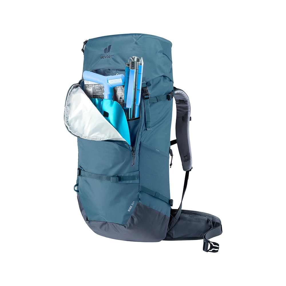 Model Deuter Rise 34+ wykonano z wysokiej jakości materiału 200D 2X2 PA Ripstop / 630D PA. Dzięki temu jest niezwykle odporny na przetarcia i rozdarcia, zachowując niską wagę. Zwarta budowa z systemem Alpine System, znakomicie utrzymuje plecak blisko środka ciężkości ciała. Nawet przy gwałtownych ruchach i trudnym terenie łatwiej zachować równowagę. Ergonomiczny tył pokryty jest oddychającym materiałem. Szelki w anatomicznym kształcie, wraz z regulowanym pasem piersiowym, idealnie dopasowują się do ciała. Na pasie biodrowym znajdują się kieszonki zapinane na suwak. Tylny panel plecaka można w pełni otworzyć, co daje prosty dostęp do całej zawartości. Posiada możliwość mocowania nart, deski, rakiet śnieżnych. Frontowa kieszeń jest łatwo dostępna i zabezpiecza zawartość. W klapie znajdują się 2 kieszonki zapinane na suwak (wewnętrzna i zewnętrzna). Jest kompatybilny z systemem H2O. Dla poprawy bezpieczeństwa wyposażony jest w instrukcję SOS i gwizdek, zamontowany w pasie piersiowym. Pojemność plecaka to 34 litry, z możliwością zwiększenia jej o 8 litrów dzięki kominowi. W komorze głównej znajduje się dodatkowa kieszonka z siatki, ułatwiająca segregację ładunku. Po bokach plecaka znajdują się elastyczne kieszonki z siatki oraz z jednej strony zapinana na suwak kieszonka na telefon.