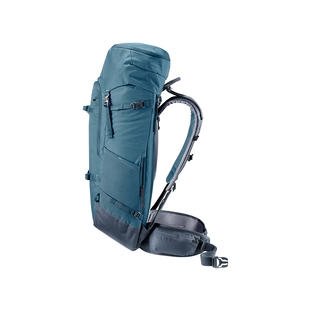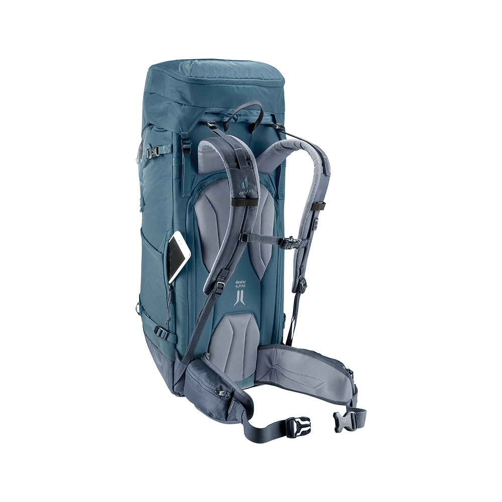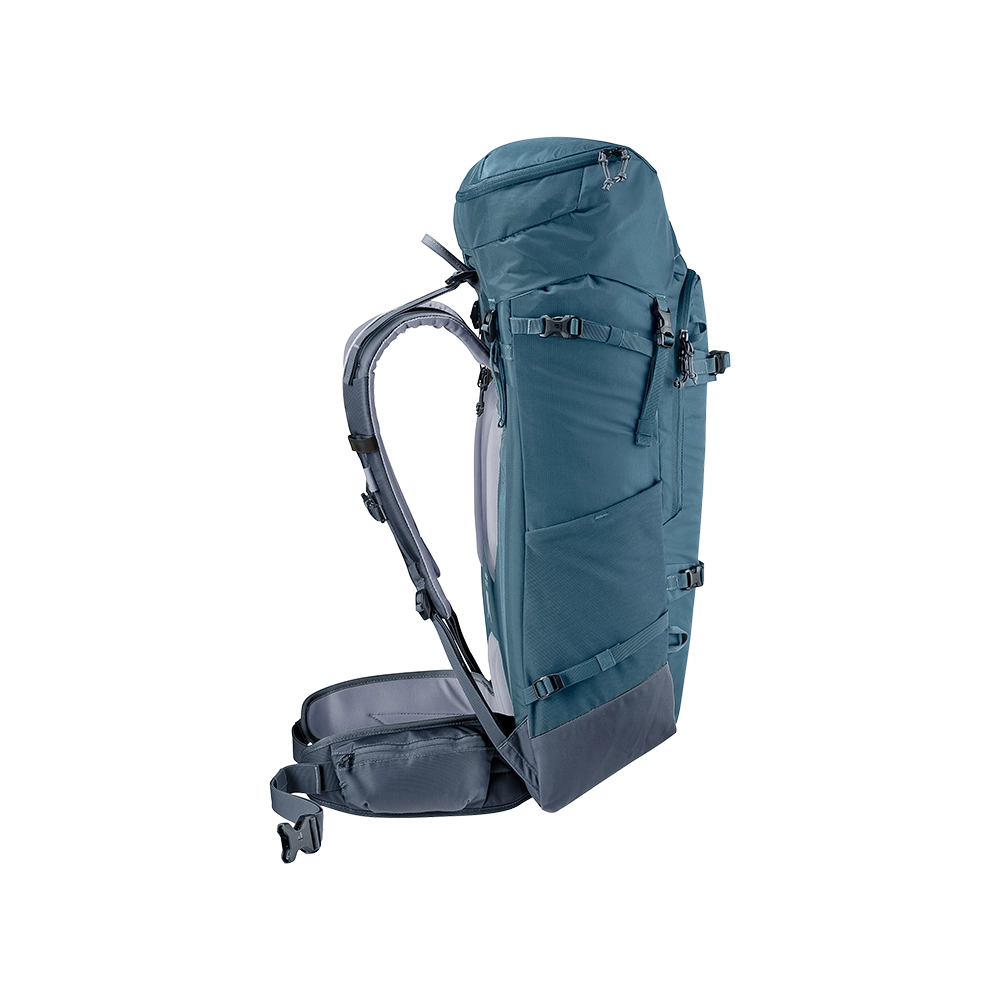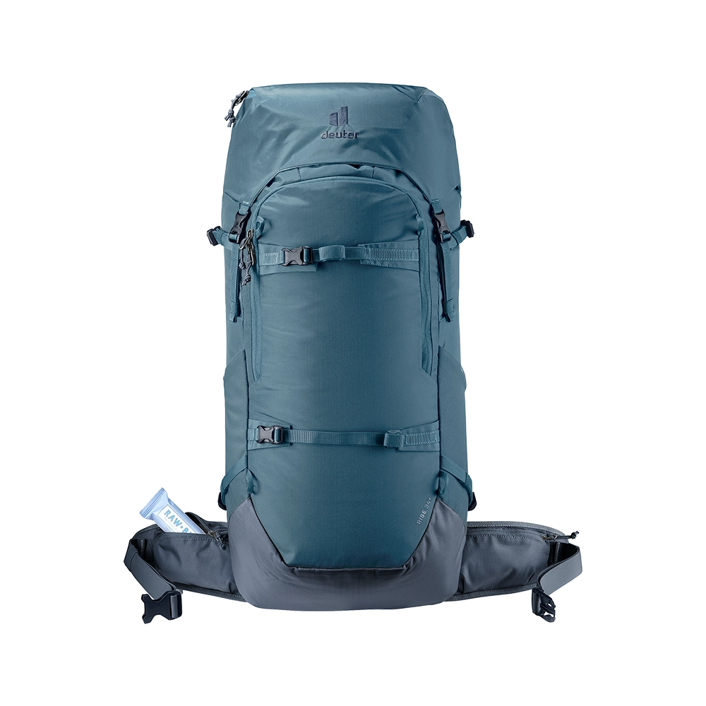 Model Deuter Rise 34+ wykonano z wysokiej jakości materiału 200D 2X2 PA Ripstop / 630D PA. Dzięki temu jest niezwykle odporny na przetarcia i rozdarcia, zachowując niską wagę. Zwarta budowa z systemem Alpine System, znakomicie utrzymuje plecak blisko środka ciężkości ciała. Nawet przy gwałtownych ruchach i trudnym terenie łatwiej zachować równowagę. Ergonomiczny tył pokryty jest oddychającym materiałem. Szelki w anatomicznym kształcie, wraz z regulowanym pasem piersiowym, idealnie dopasowują się do ciała. Na pasie biodrowym znajdują się kieszonki zapinane na suwak. Tylny panel plecaka można w pełni otworzyć, co daje prosty dostęp do całej zawartości. Posiada możliwość mocowania nart, deski, rakiet śnieżnych. Frontowa kieszeń jest łatwo dostępna i zabezpiecza zawartość. W klapie znajdują się 2 kieszonki zapinane na suwak (wewnętrzna i zewnętrzna). Jest kompatybilny z systemem H2O. Dla poprawy bezpieczeństwa wyposażony jest w instrukcję SOS i gwizdek, zamontowany w pasie piersiowym. Pojemność plecaka to 34 litry, z możliwością zwiększenia jej o 8 litrów dzięki kominowi. W komorze głównej znajduje się dodatkowa kieszonka z siatki, ułatwiająca segregację ładunku. Po bokach plecaka znajdują się elastyczne kieszonki z siatki oraz z jednej strony zapinana na suwak kieszonka na telefon.