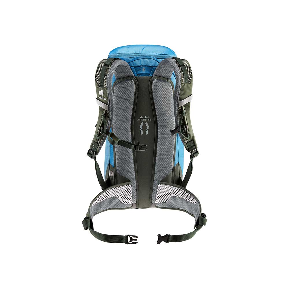System nośny Deuter Airstripes stanowią dwa rzędy poduszek wypełnionych otwarto-komorową pianką pokrytą od zewnątrz oddychającą siatką Wide AirMesh. Rozwiązanie to zapewnia dobre przyleganie plecaka do pleców oraz zachowuje odpowiedni stopień wentylacji. System nośny dodatkowo napina elastyczny pręt Delrin® pozwalający nosić większe ładunki bez zniekształcenia plecaka. Utrzymuje on plecak bliżej pleców i zapewnia lepsze przenoszenie ciężaru. Elastyczne szelki dopasowują się idealnie do każdej sylwetki. Posiadają płynnie regulowany pas piersiowy wyposażony w gwizdek, paski regulujące położenie ładunku, elastyczne pętle na rurkę od bukłaka oraz szpejarki. Anatomiczny pas biodrowy posiada nowy sposób regulacji Pull-Forward, poprzez ściągnięcie obu troków przed sobą (taki mechanizm regulacji pasa wymaga zdecydowanie mniej siły przy ściąganiu troków oraz zapewnia precyzyjniejsze dopasowanie go do bioder). Pas biodrowy jest obszerny i odpowiednio wyprofilowany co zapewnia wysoki komfort i doskonale przenosi obciążenie na biodra. Jest on dodatkowo wentylowany co zapewnia lepszy komfort użytkowania. Plecak wyposażony jest także w uchwyt do przenoszenia lub zawieszania oraz pokrowiec przeciwdeszczowy w jaskrawo zielonym kolorze.