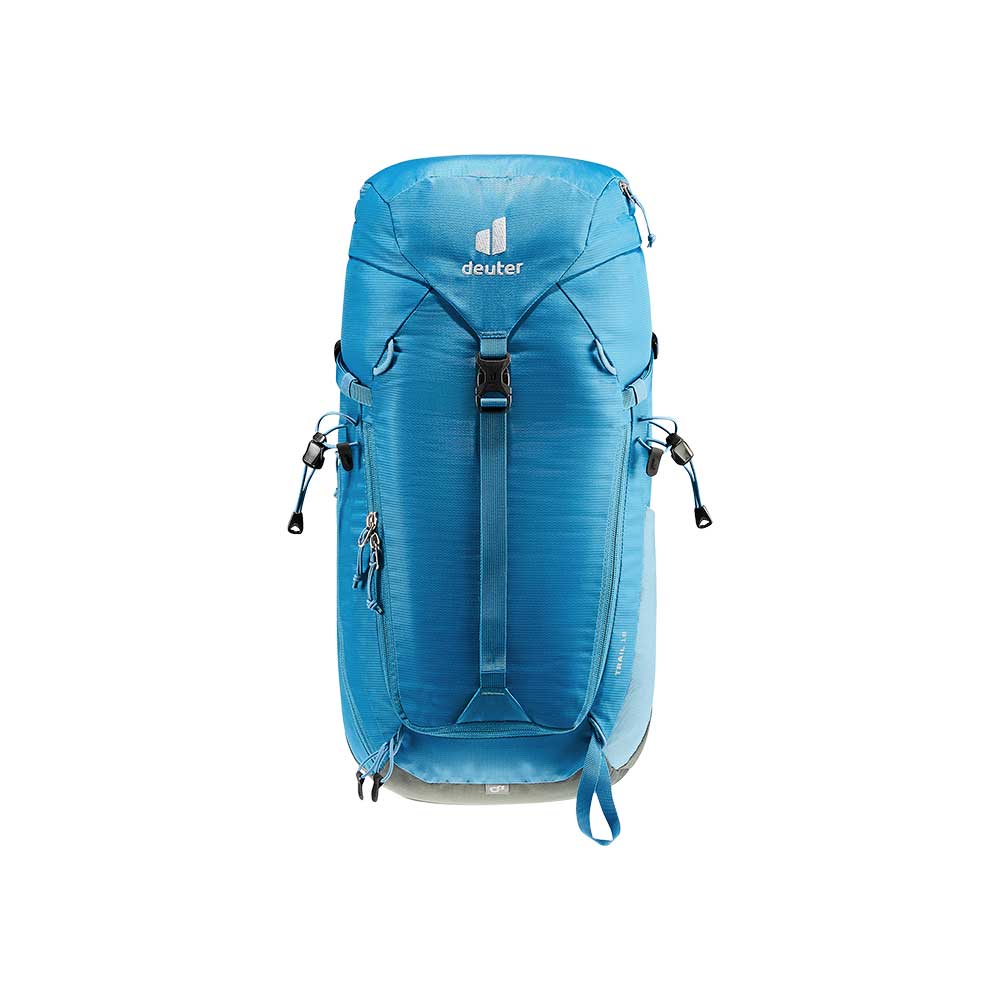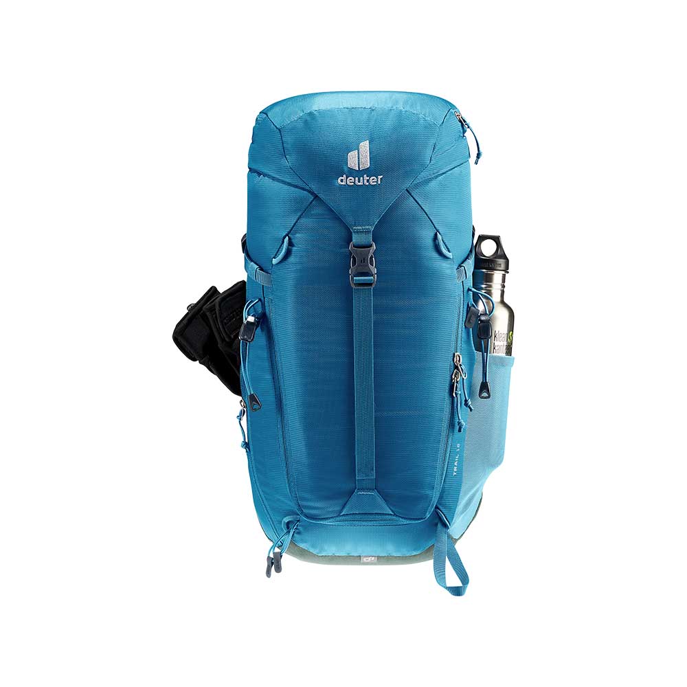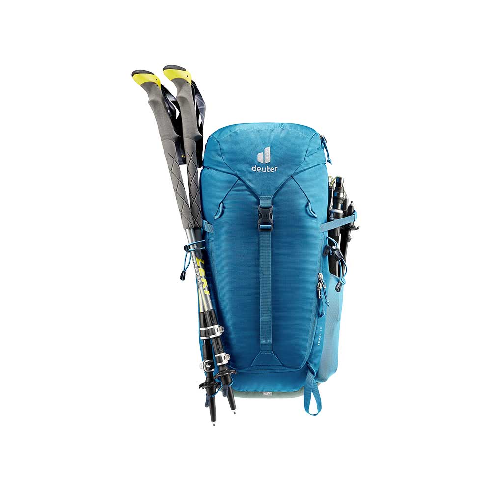 Plecak Deuter Trail 18 to doskonały wybór na jednodniowe górskie wypady. Posiada jedną komorę, do której dostęp możliwy jest od strony komina lub od frontu za pomocą dwukierunkowego suwaka. Posiada dużą ilość kieszeni pozwalających właściwie segregować bagaż. Po bokach z jednej strony znajduje się kieszeń zapinana na suwak a z drugiej elastyczna kieszeń z siatki. Z frontu znajdują się pętelki do montażu siatki na kask (siatka nie jest w zestawie). Plecak oferuje również możliwość mocowania kijów trekkingowych oraz czekana. W klapie znajdziemy 2 kieszenie zapinane na suwak wewnętrzną oraz zewnętrzną z uchwytem na klucze. Boczne pasy kompresyjne umożliwiają zmniejszenie pojemności jeżeli istnieje taka potrzeba. Komora główna kompatybilna jest z systemami H2O, posiada przegrodę na umieszczenie bukłaka lub na mokrą odzież. Zamykana jest szybkim w obsłudze ściągaczem.