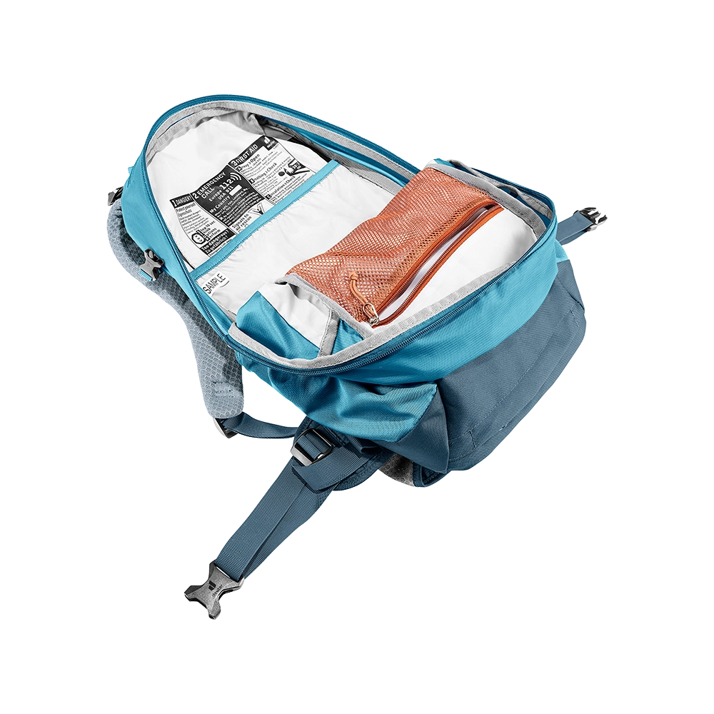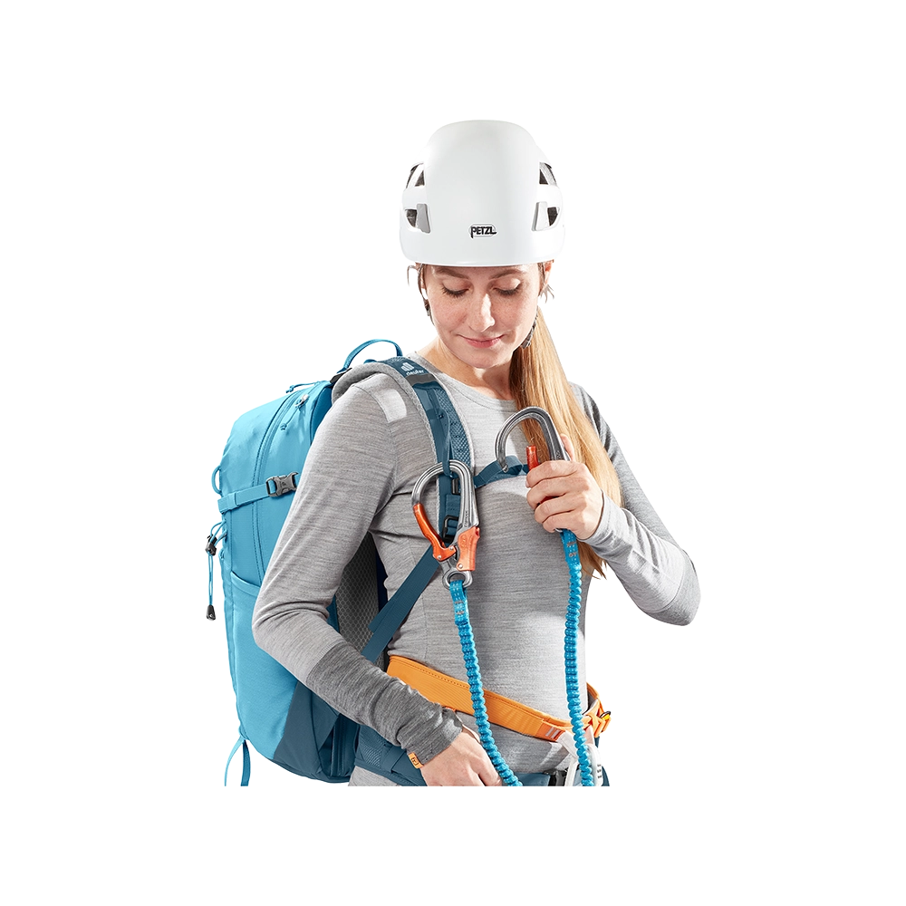 Idealny towarzysz na krótkie wypady w góry, plecak Deuter Trail 23 SL oferuje jedną komorę z dostępem od góry za pomocą dwukierunkowego suwaka. Wyposażony w kilka kieszeni, ułatwiających segregację bagażu, oraz elastyczne kieszenie z siatki po bokach. Przednią kieszeń można wykorzystać do przenoszenia kasku, bluzy czy kurtki. Ponadto, plecak posiada funkcję mocowania kijów trekkingowych oraz czekana, a na szczycie znajduje się mała kieszeń z uchwytem na klucze. Boczne pasy kompresyjne pozwalają dostosować pojemność do potrzeb użytkownika. Komora główna jest kompatybilna z systemami H2O, zawiera przegrodę na bukłak lub mokrą odzież oraz siatkową kieszeń na suwak. Na froncie plecaka znajdują się również uchwyty do mocowania siatki na kask (siatka nie jest częścią wyposażenia).