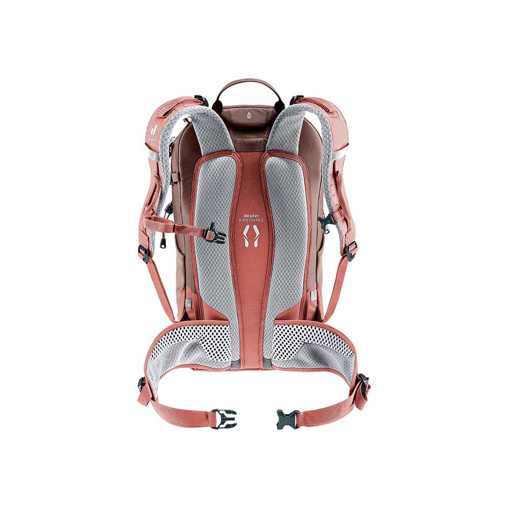 System nośny Deuter Airstripes składa się z dwóch rzędów poduszek wypełnionych otwarto-komorową pianką, pokrytych oddychającą siatką Wide AirMesh. Zapewniają one odpowiednie przyleganie do pleców oraz wentylację. Dodatkowo, elastyczny pręt Delrin® utrzymuje plecak bliżej pleców, co ułatwia przenoszenie ciężaru. Elastyczne szelki idealnie dopasowują się do sylwetki, a regulowany pas piersiowy wyposażony w gwizdek, paski regulujące ładunek, elastyczne pętle na rurkę od bukłaka oraz szpejarki, zapewniają wygodę użytkowania. Anatomiczny pas biodrowy z nowym sposobem regulacji Pull-Forward gwarantuje precyzyjne dopasowanie i wysoki komfort noszenia.