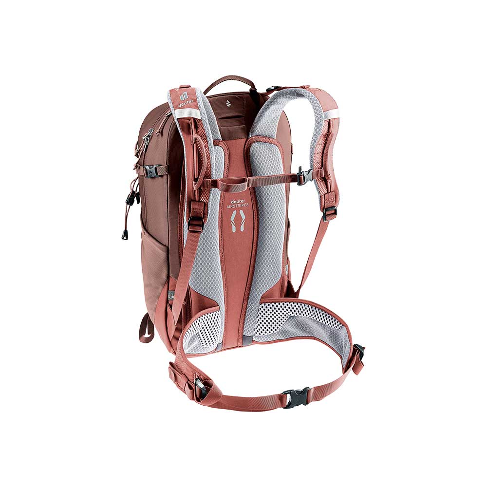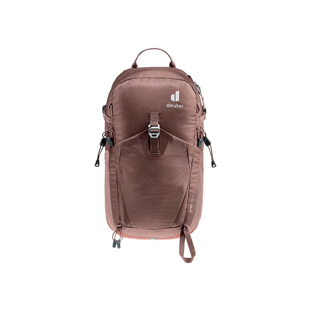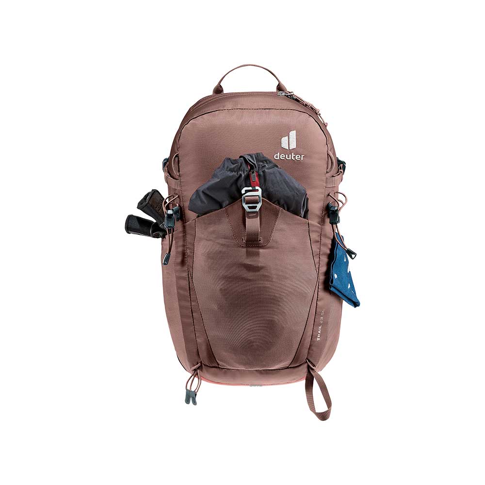 Idealny towarzysz na krótkie wypady w góry, plecak Deuter Trail 23 SL oferuje jedną komorę z dostępem od góry za pomocą dwukierunkowego suwaka. Wyposażony w kilka kieszeni ułatwiających segregację bagażu oraz posiada elastyczne kieszenie z siatki po bokach. Przednia kieszeń idealnie nadaje się do przenoszenia kasku, bluzy czy kurtki. Ponadto, plecak posiada funkcję mocowania kijów trekkingowych oraz czekana, a na szczycie znajduje się mała kieszeń z uchwytem na klucze. Boczne pasy kompresyjne pozwalają dostosować pojemność do potrzeb użytkownika. Komora główna jest kompatybilna z systemami H2O, zawiera przegrodę na bukłak lub mokrą odzież oraz siatkową kieszeń na suwak. Na froncie plecaka znajdują się również uchwyty do mocowania siatki na kask (siatka nie jest częścią wyposażenia).