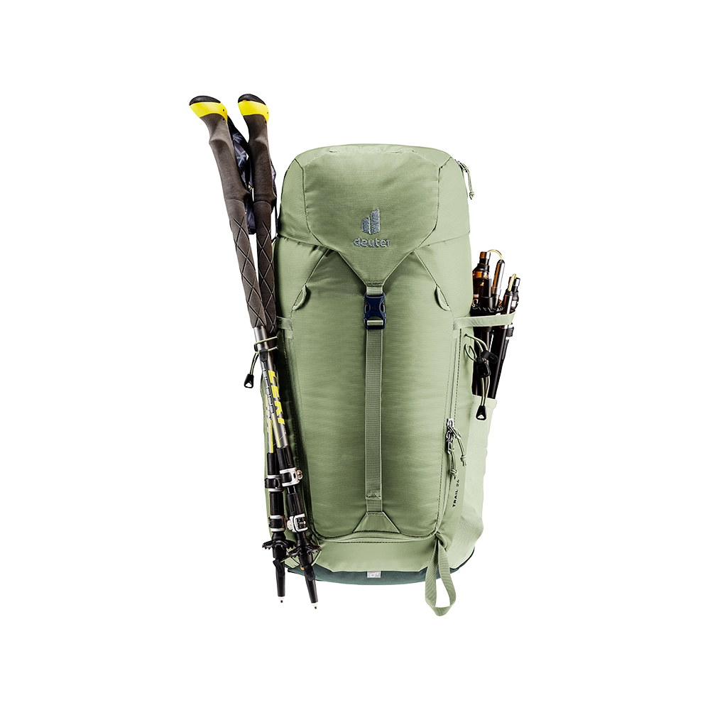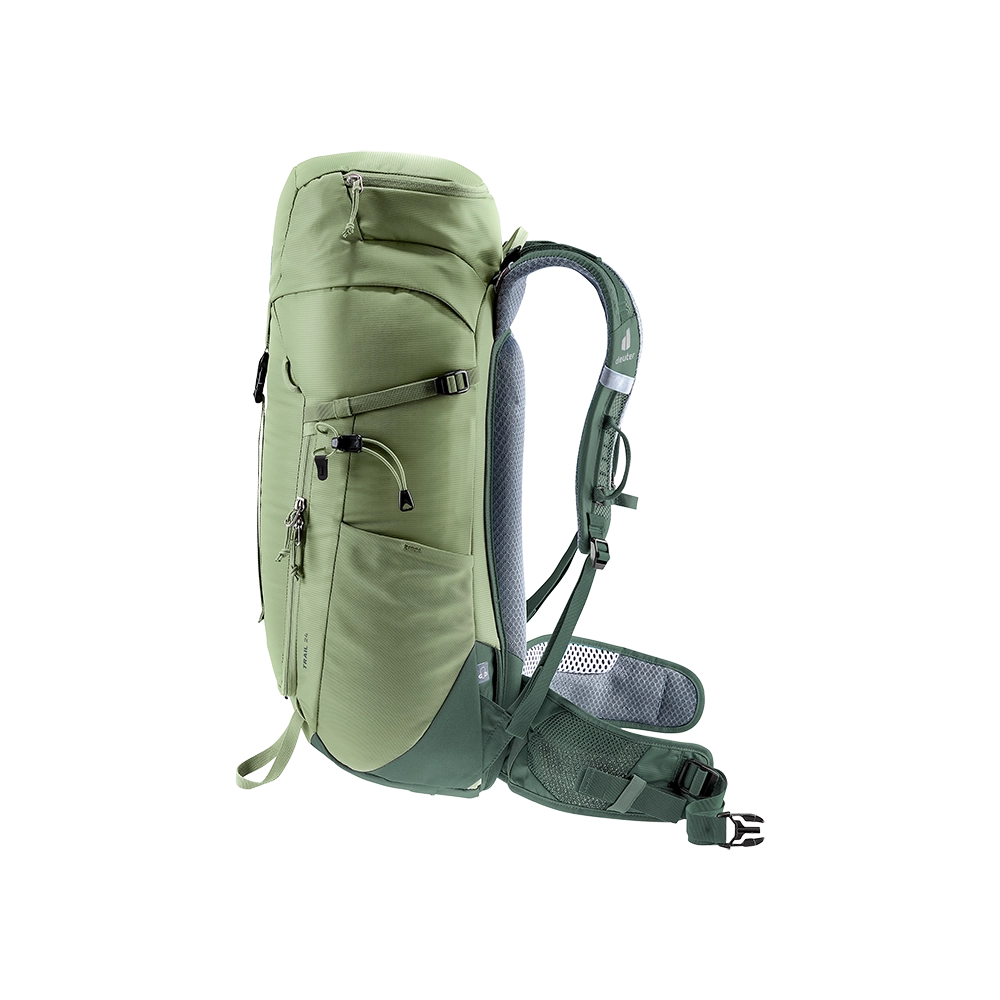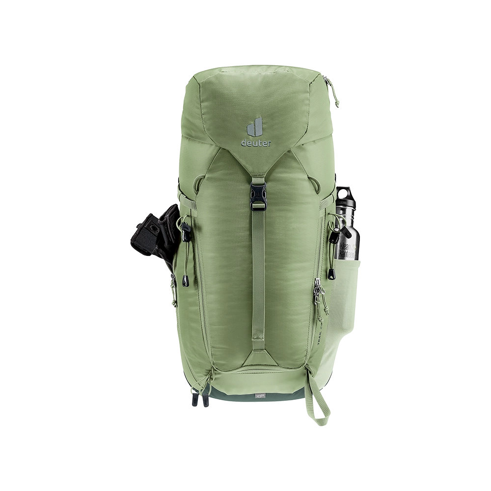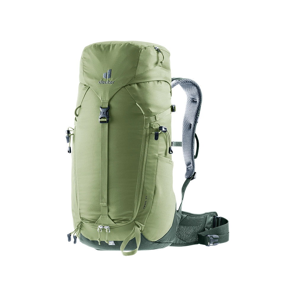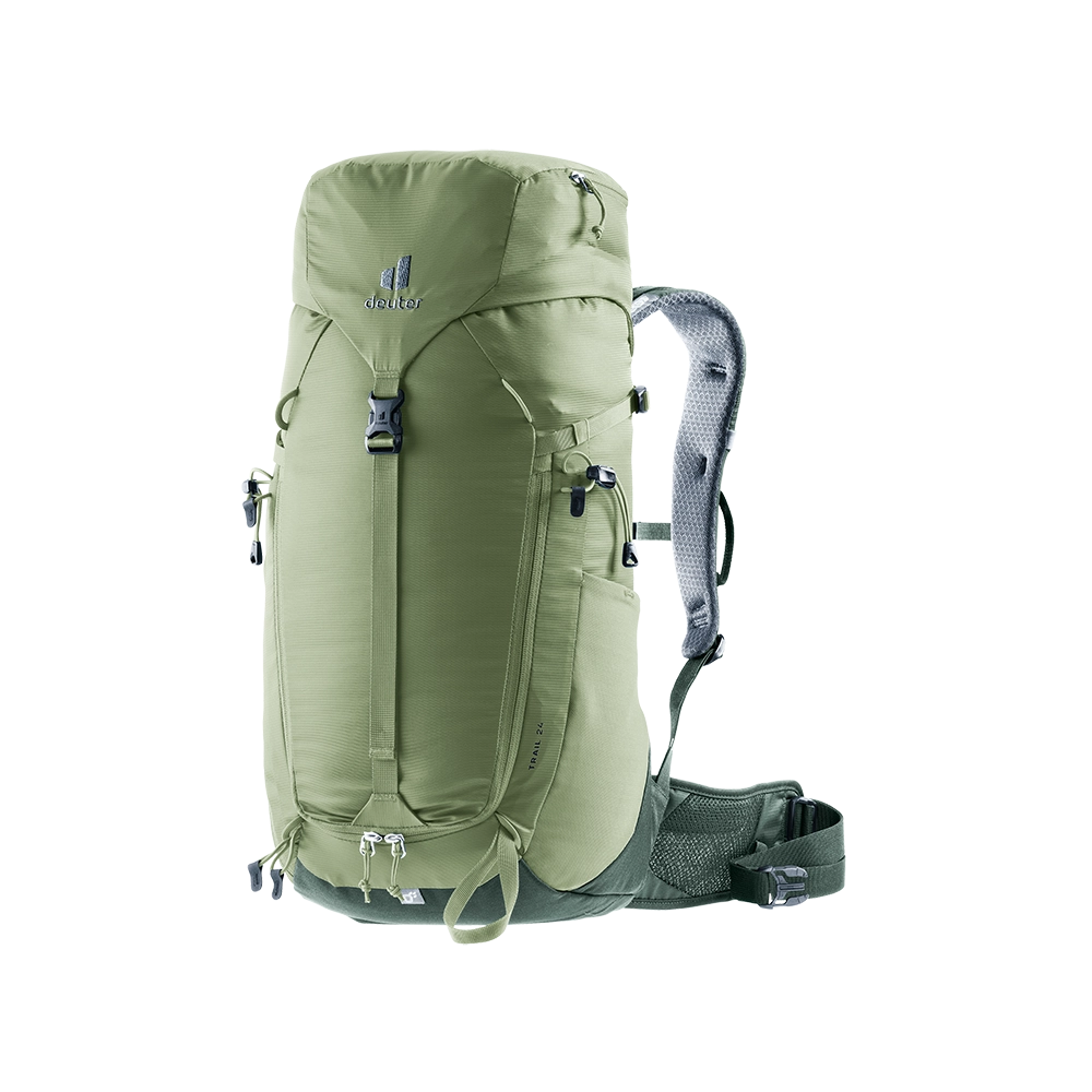 Plecak Deuter Trail 24 to doskonały wybór na jednodniowe górskie wypady. Posiada jedną komorę, do której dostęp możliwy jest od strony komina lub od frontu za pomocą dwukierunkowego suwaka. Posiada dużą ilość kieszeni pozwalających właściwie segregować bagaż. Po bokach z jednej strony znajduje się kieszeń zapinana na suwak a z drugiej elastyczna kieszeń z siatki. Z frontu znajdują się pętelki do montażu siatki na kask (siatka nie jest w zestawie). Plecak oferuje również możliwość mocowania kijów trekkingowych oraz czekana. W klapie znajdziemy 2 kieszenie zapinane na suwak wewnętrzną oraz zewnętrzną z uchwytem na klucze. Boczne pasy kompresyjne umożliwiają zmniejszenie pojemności jeżeli istnieje taka potrzeba. Komora główna kompatybilna jest z systemami H2O, posiada przegrodę na umieszczenie bukłaka lub na mokrą odzież. Zamykana jest szybkim w obsłudze ściągaczem.