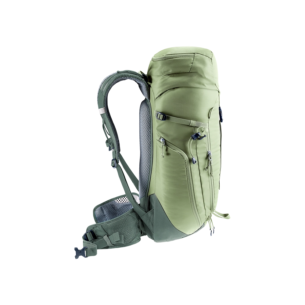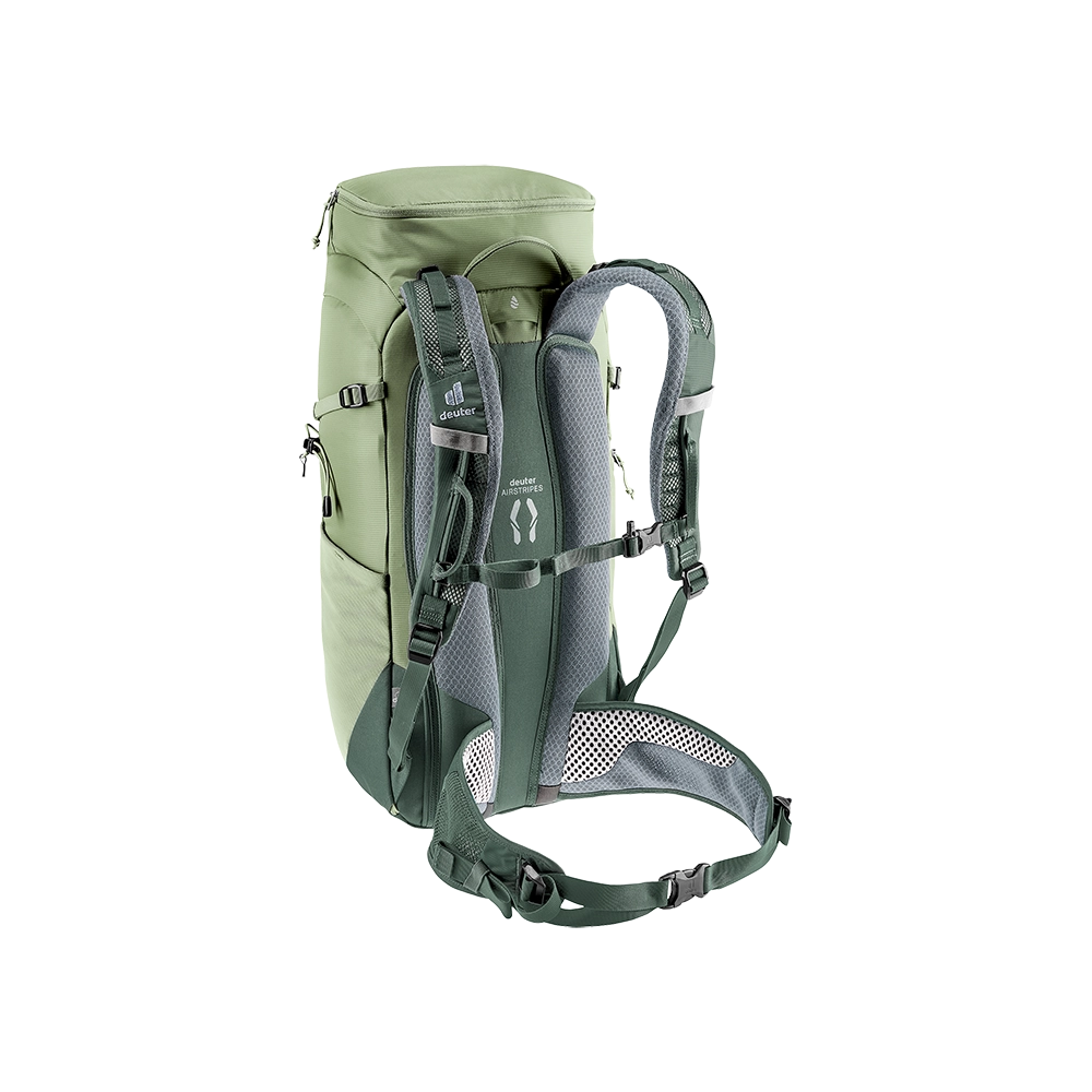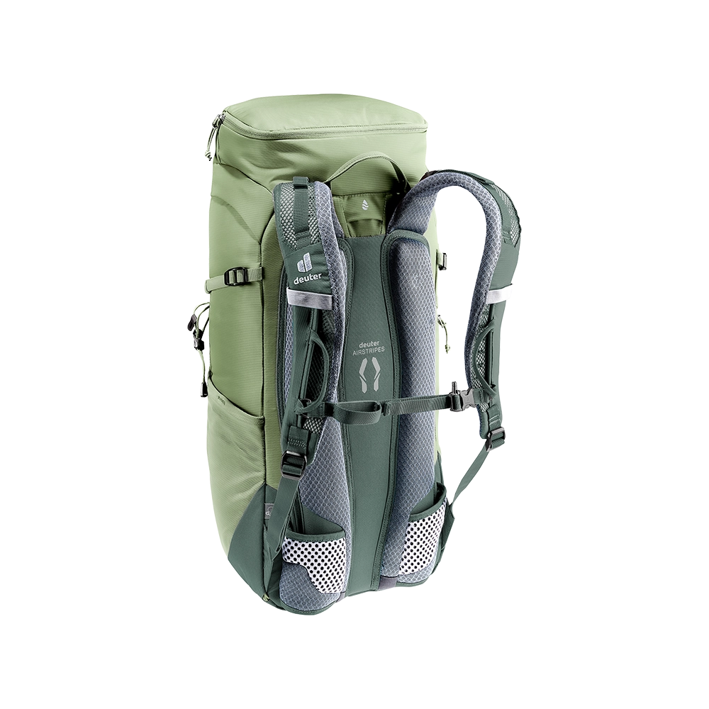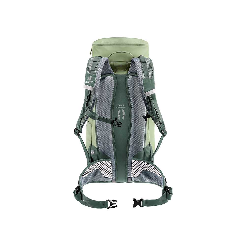 System nośny Deuter Airstripes stanowią dwa rzędy poduszek wypełnionych otwarto-komorową pianką pokrytą od zewnątrz oddychającą siatką Wide AirMesh. Rozwiązanie to zapewnia dobre przyleganie plecaka do pleców oraz zachowuje odpowiedni stopień wentylacji. System nośny dodatkowo napina elastyczny pręt Delrin® pozwalający nosić większe ładunki bez zniekształcenia plecaka. Utrzymuje on plecak bliżej pleców i zapewnia lepsze przenoszenie ciężaru. Elastyczne szelki dopasowują się idealnie do każdej sylwetki. Posiadają płynnie regulowany pas piersiowy wyposażony w gwizdek, paski regulujące położenie ładunku, elastyczne pętle na rurkę od bukłaka oraz szpejarki. Anatomiczny pas biodrowy posiada nowy sposób regulacji Pull-Forward, poprzez ściągnięcie obu troków przed sobą (taki mechanizm regulacji pasa wymaga zdecydowanie mniej siły przy ściąganiu troków oraz zapewnia precyzyjniejsze dopasowanie go do bioder). Pas biodrowy jest obszerny i odpowiednio wyprofilowany co zapewnia wysoki komfort i doskonale przenosi obciążenie na biodra. Jest on dodatkowo wentylowany co zapewnia lepszy komfort użytkowania. Plecak wyposażony jest także w uchwyt do przenoszenia lub zawieszania oraz pokrowiec przeciwdeszczowy w jaskrawo zielonym kolorze.