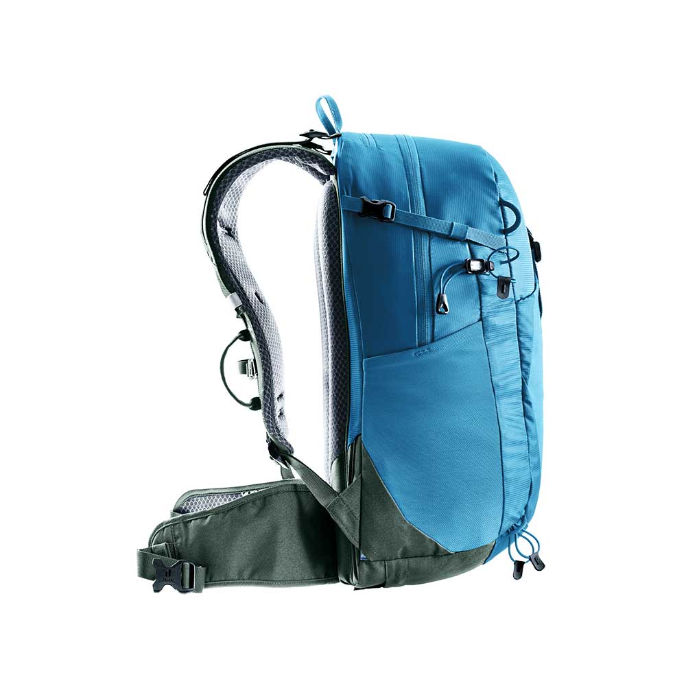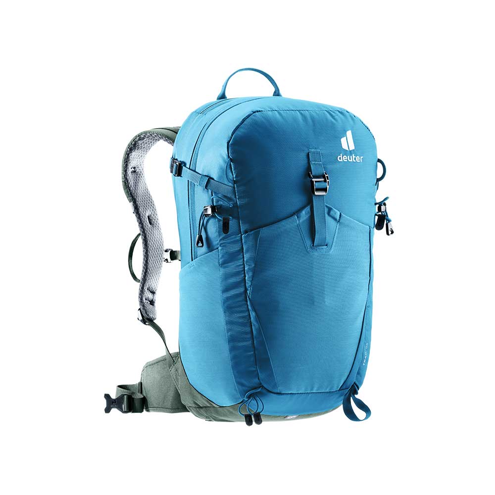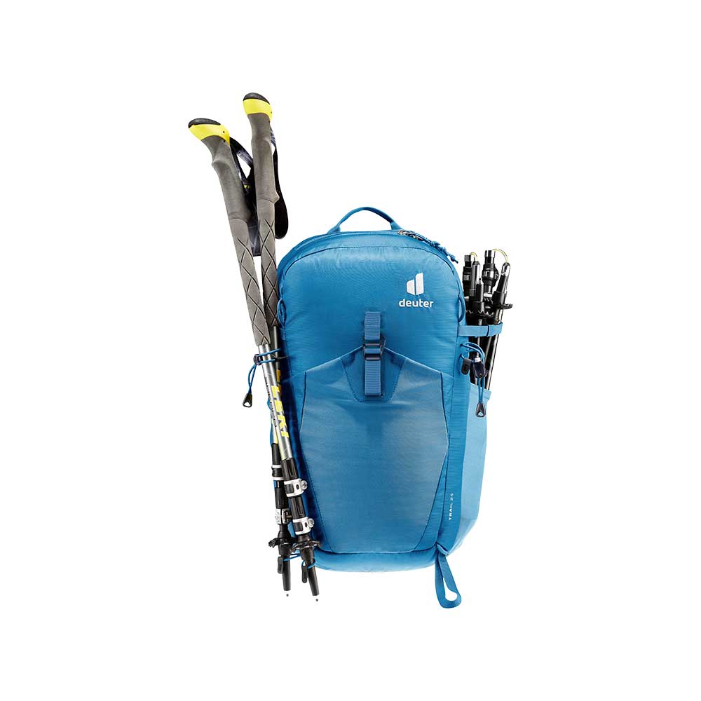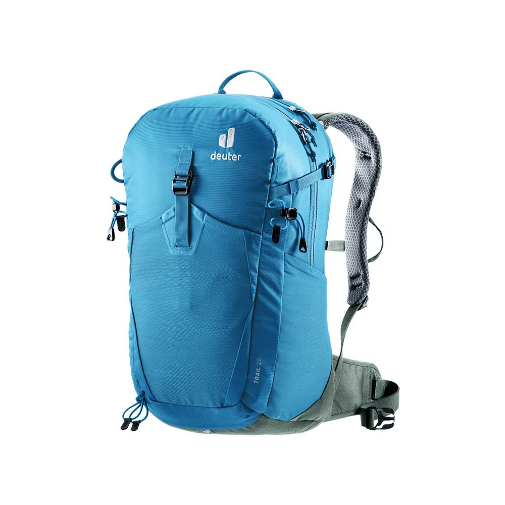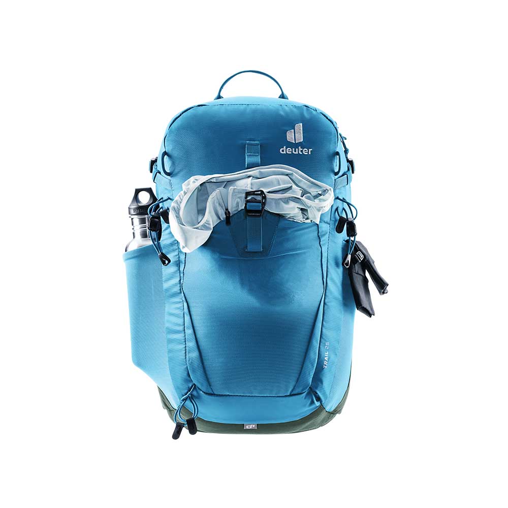 Plecak Deuter Trail 25 to idealny towarzysz na krótkie wypady w góry. Posiada jedną komorę, do której dostęp możliwy jest od góry za pomocą dwukierunkowego suwaka. Posiada kilka kieszeni pozwalających właściwie segregować bagaż. Po obu bokach znajdują się elastyczne kieszenie z siatki. Z frontu znajduje się kieszeń przeznaczona do transportu kasku lub np. bluzy czy też kurtki. Plecak oferuje również możliwość mocowania kijów trekkingowych oraz czekana. Na szczycie znajduje się mała kieszeń z uchwytem na klucze. Boczne pasy kompresyjne umożliwiają zmniejszenie pojemności jeżeli istnieje taka potrzeba. Komora główna kompatybilna jest z systemami H2O, posiada przegrodę na umieszczenie bukłaka lub na mokrą odzież oraz małą siatkową kieszonkę zapinana na suwak.