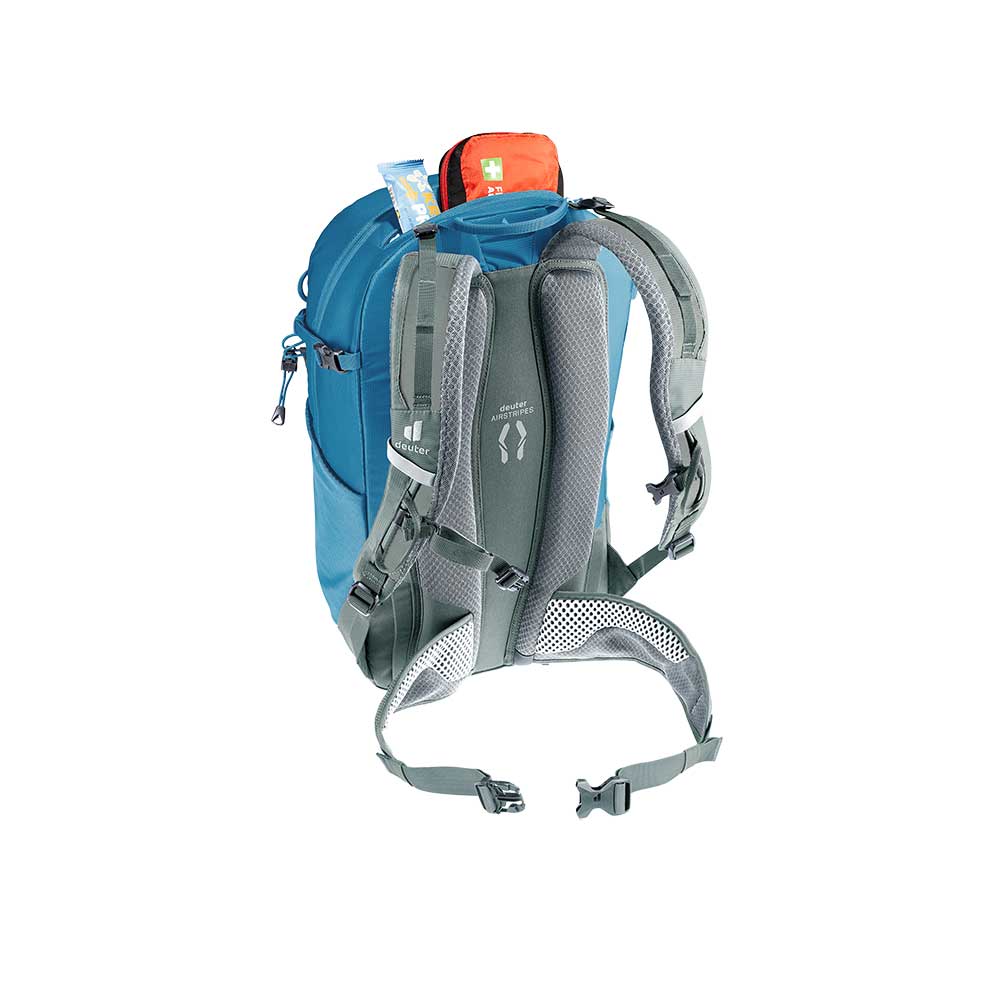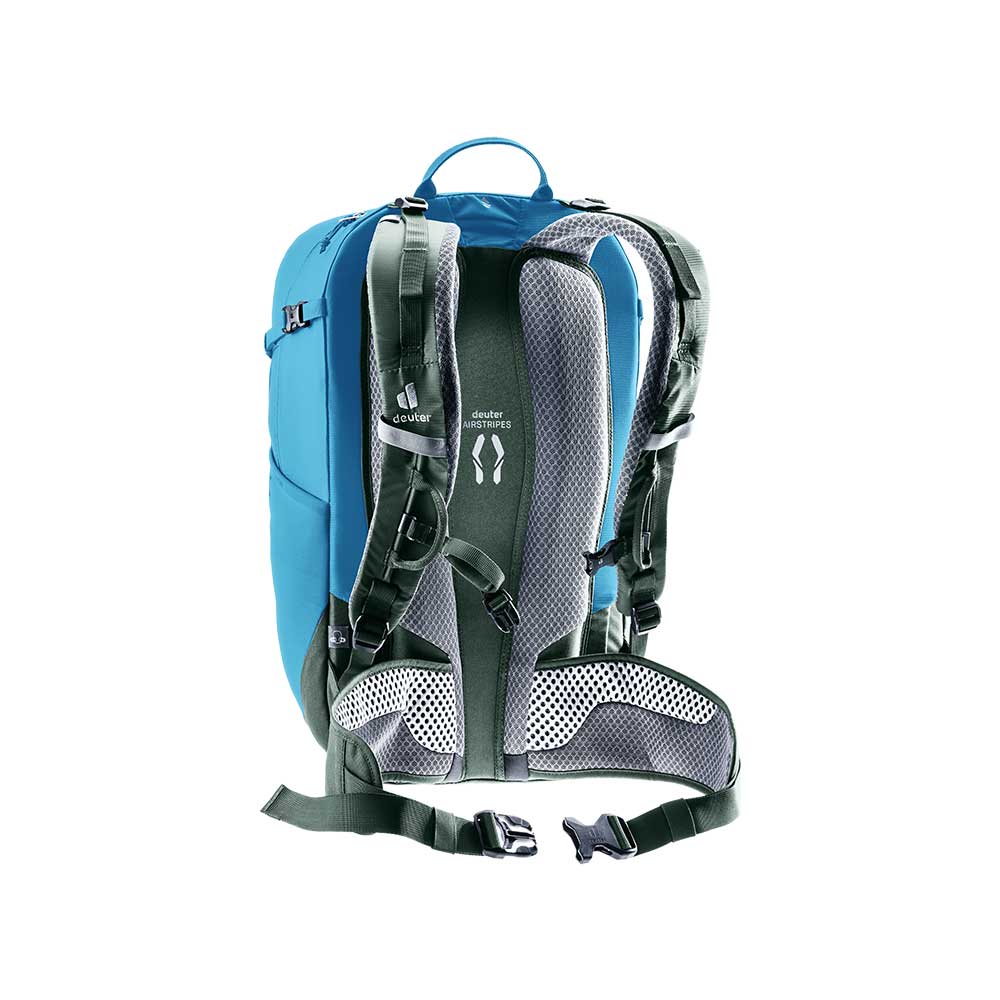 System nośny Deuter Airstripes stanowią dwa rzędy poduszek wypełnionych otwarto-komorową pianką pokrytą od zewnątrz oddychającą siatką Wide AirMesh. Rozwiązanie to zapewnia dobre przyleganie plecaka do pleców oraz zachowuje odpowiedni stopień wentylacji. System nośny dodatkowo napina elastyczny pręt Delrin® pozwalający nosić większe ładunki bez zniekształcenia plecaka. Utrzymuje on plecak bliżej pleców i zapewnia lepsze przenoszenie ciężaru. Elastyczne szelki dopasowują się idealnie do każdej sylwetki. Posiadają płynnie regulowany pas piersiowy, paski regulujące położenie ładunku, elastyczne pętle na rurkę od bukłaka oraz szpejarki. Pas biodrowy jest obszerny i odpowiednio wyprofilowany co zapewnia wysoki komfort i doskonale przenosi obciążenie na biodra. Plecak wyposażony jest także w uchwyt do przenoszenia lub zawieszania oraz pokrowiec przeciwdeszczowy w jaskrawo zielonym kolorze.