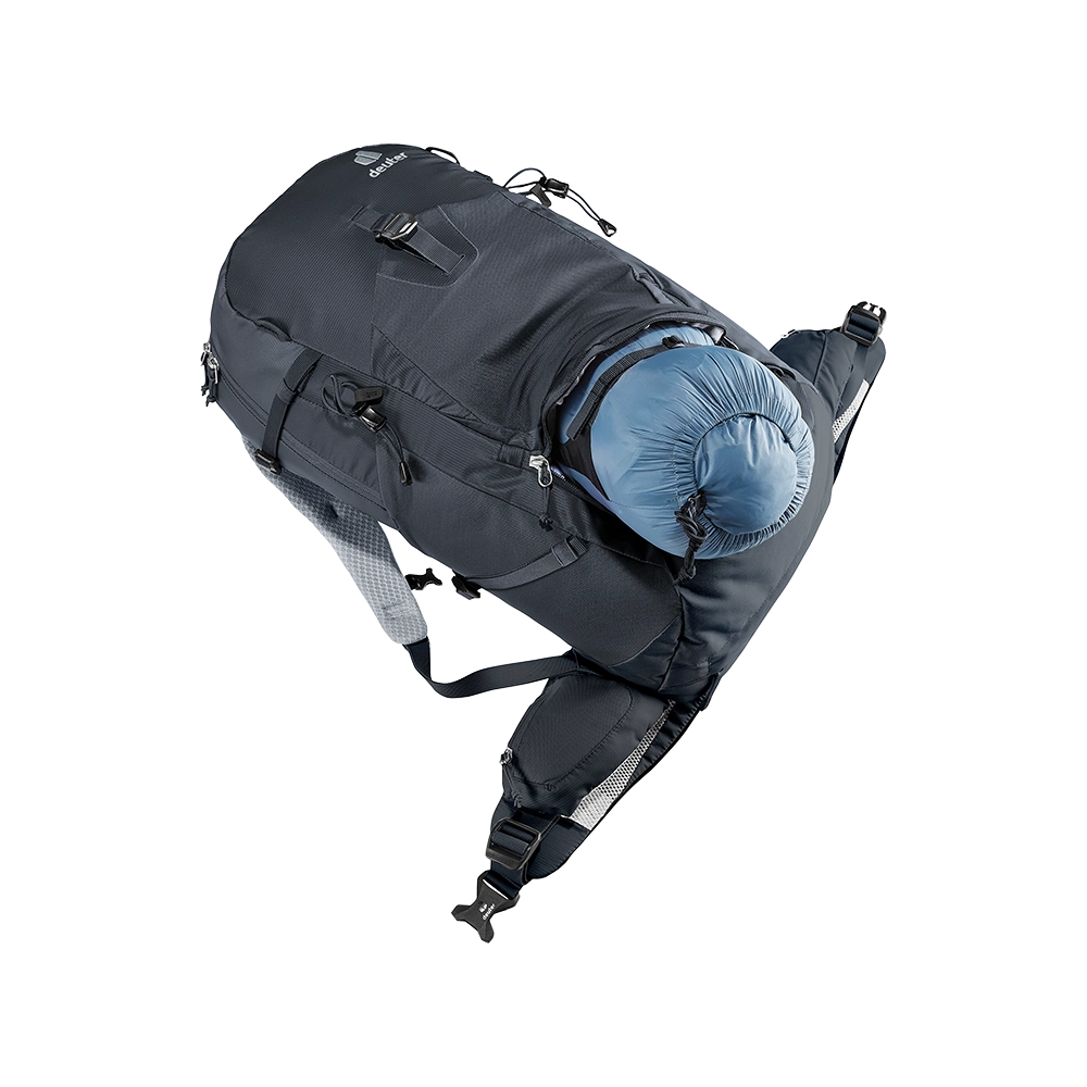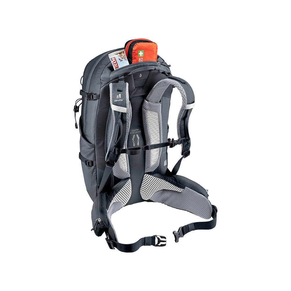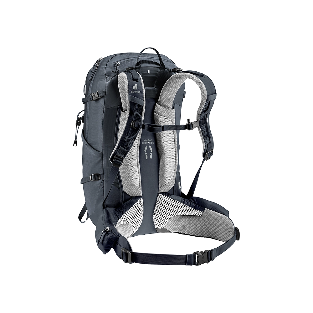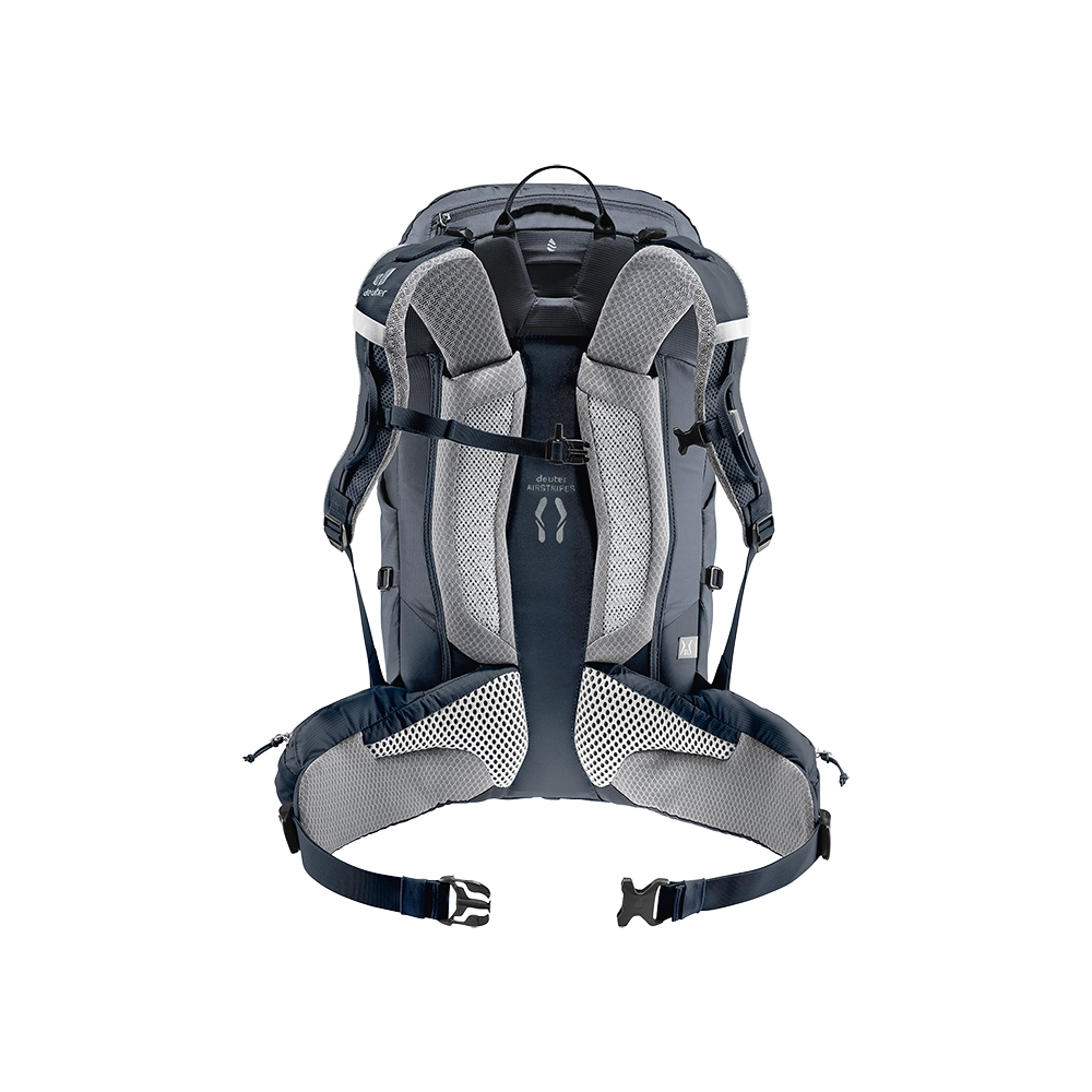 System nośny Deuter Airstripes stanowią dwa rzędy poduszek wypełnionych otwarto-komorową pianką pokrytą od zewnątrz oddychającą siatką Wide AirMesh. Rozwiązanie to zapewnia dobre przyleganie plecaka do pleców oraz zachowuje odpowiedni stopień wentylacji. System nośny dodatkowo napina elastyczny pręt Delrin® pozwalający nosić większe ładunki bez zniekształcenia plecaka. Utrzymuje on plecak bliżej pleców i zapewnia lepsze przenoszenie ciężaru. Elastyczne szelki dopasowują się idealnie do każdej sylwetki. Posiadają płynnie regulowany pas piersiowy, paski regulujące położenie ładunku, elastyczne pętle na rurkę od bukłaka oraz szpejarki. Anatomiczny pas biodrowy posiada nowy sposób regulacji Pull-Forward, poprzez ściągnięcie obu troków przed sobą (taki mechanizm regulacji pasa wymaga zdecydowanie mniej siły przy ściąganiu troków oraz zapewnia precyzyjniejsze dopasowanie go do bioder). Pas biodrowy jest bardzo obszerny i odpowiednio wyprofilowany co zapewnia wysoki komfort i doskonale przenosi obciążenie na biodra. Na pasie znajdują się również dwie kieszenie zapinane na suwak. Plecak wyposażony jest także w uchwyt do przenoszenia lub zawieszania oraz pokrowiec przeciwdeszczowy w jaskrawo zielonym kolorze.