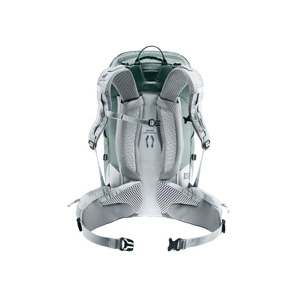 System nośny Deuter Airstripes stanowią dwa rzędy poduszek wypełnionych otwarto-komorową pianką pokrytą od zewnątrz oddychającą siatką Wide AirMesh. Rozwiązanie to zapewnia dobre przyleganie plecaka do pleców oraz zachowuje odpowiedni stopień wentylacji. System nośny dodatkowo napina elastyczny pręt Delrin® pozwalający nosić większe ładunki bez zniekształcenia plecaka. Utrzymuje on plecak bliżej pleców i zapewnia lepsze przenoszenie ciężaru. Elastyczne szelki dopasowują się idealnie do każdej sylwetki. Posiadają płynnie regulowany pas piersiowy, paski regulujące położenie ładunku, elastyczne pętle na rurkę od bukłaka oraz szpejarki. Anatomiczny pas biodrowy posiada nowy sposób regulacji Pull-Forward, poprzez ściągnięcie obu troków przed sobą (taki mechanizm regulacji pasa wymaga zdecydowanie mniej siły przy ściąganiu troków oraz zapewnia precyzyjniejsze dopasowanie go do bioder). Pas biodrowy jest bardzo obszerny i odpowiednio wyprofilowany co zapewnia wysoki komfort i doskonale przenosi obciążenie na biodra. Na pasie znajdują się również dwie kieszenie zapinane na suwak. Plecak wyposażony jest także w uchwyt do przenoszenia lub zawieszania oraz pokrowiec przeciwdeszczowy w jaskrawo zielonym kolorze.