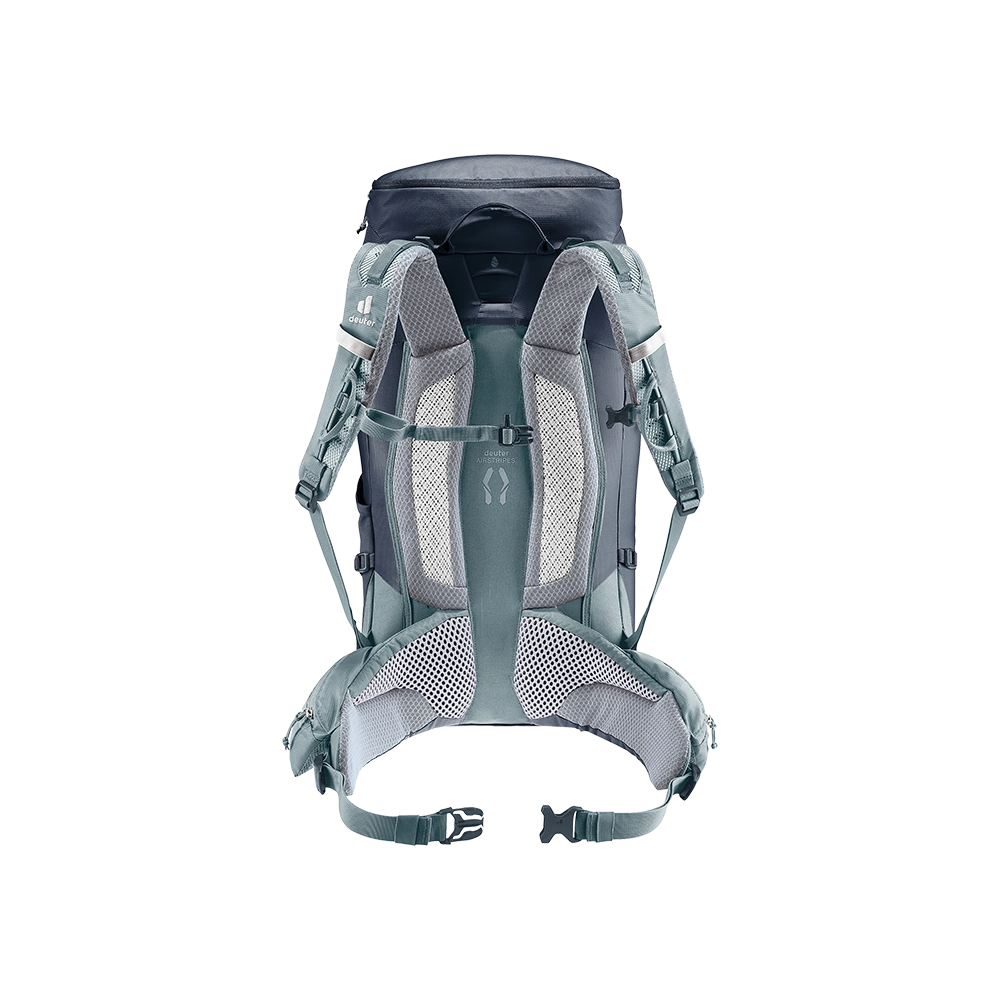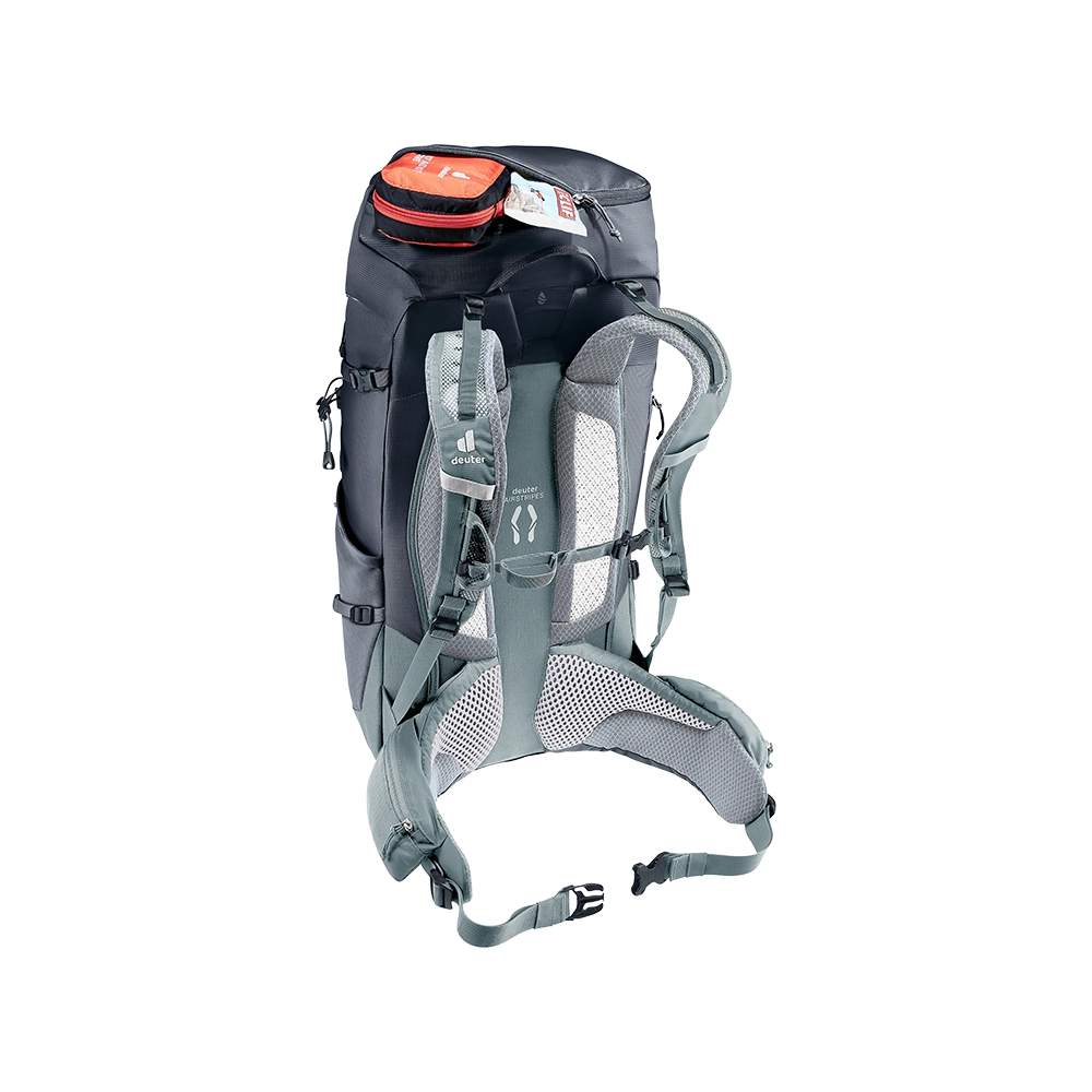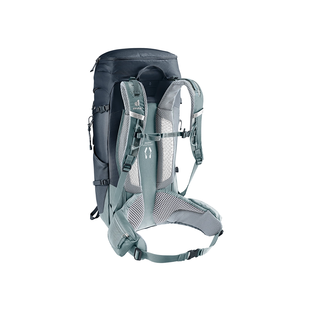 System nośny Deuter Airstripes stanowią dwa rzędy poduszek wypełnionych otwarto-komorową pianką pokrytą od zewnątrz oddychającą siatką Wide AirMesh. Rozwiązanie to zapewnia dobre przyleganie plecaka do pleców oraz zachowuje odpowiedni stopień wentylacji. System nośny dodatkowo napina elastyczny pręt Delrin® pozwalający nosić większe ładunki bez zniekształcenia plecaka. Utrzymuje on plecak bliżej pleców i zapewnia lepsze przenoszenie ciężaru. Elastyczne szelki dopasowują się idealnie do każdej sylwetki. Posiadają płynnie regulowany pas piersiowy, paski regulujące położenie ładunku, elastyczne pętle na rurkę od bukłaka oraz szpejarki. Anatomiczny pas biodrowy posiada nowy sposób regulacji Pull-Forward, poprzez ściągnięcie obu troków przed sobą (taki mechanizm regulacji pasa wymaga zdecydowanie mniej siły przy ściąganiu troków oraz zapewnia precyzyjniejsze dopasowanie go do bioder). Pas biodrowy jest bardzo obszerny i odpowiednio wyprofilowany co zapewnia wysoki komfort i doskonale przenosi obciążenie na biodra. Na pasie znajdują się również dwie kieszenie zapinane na suwak. Plecak wyposażony jest także w uchwyt do przenoszenia lub zawieszania oraz pokrowiec przeciwdeszczowy w jaskrawo zielonym kolorze.
