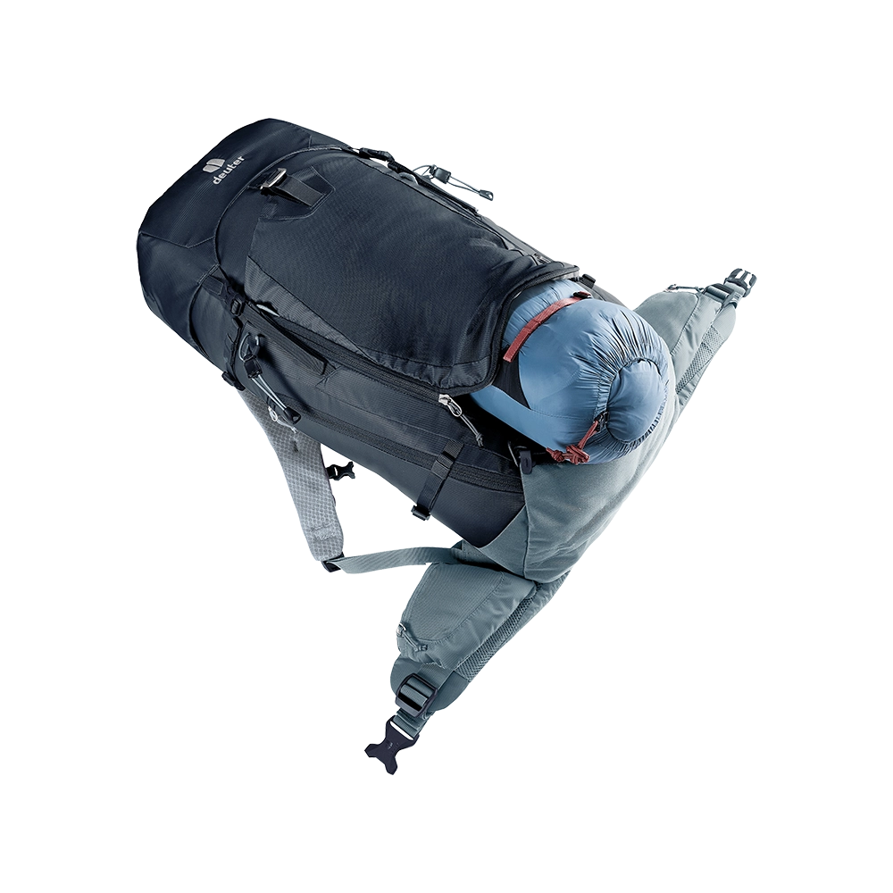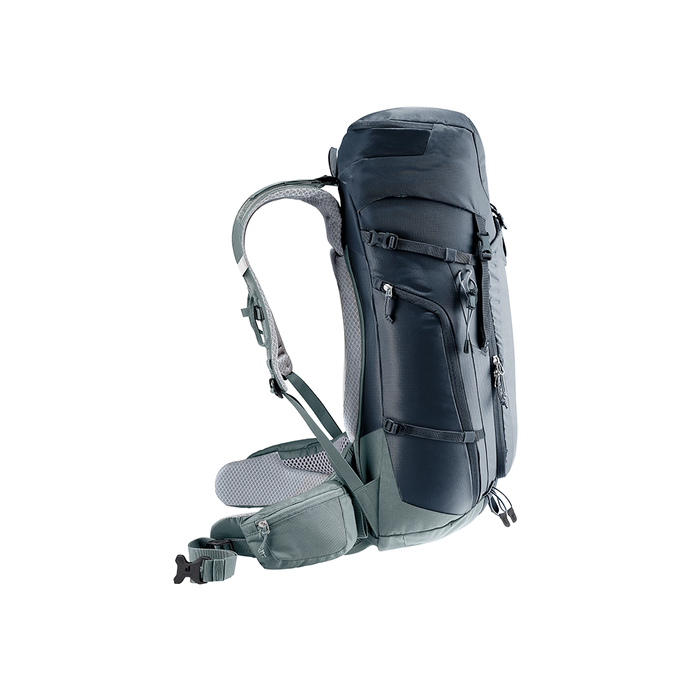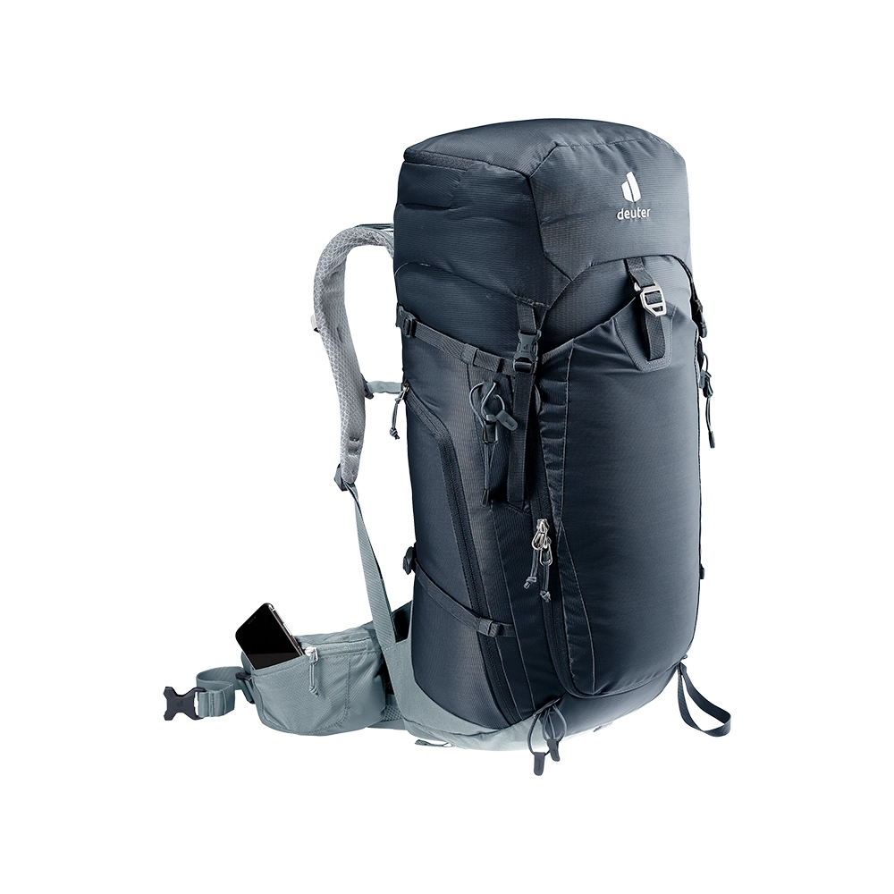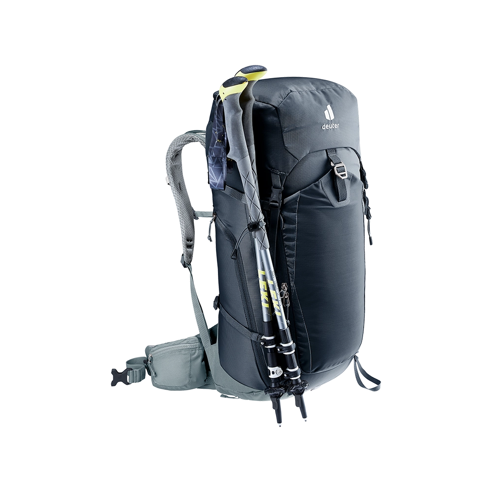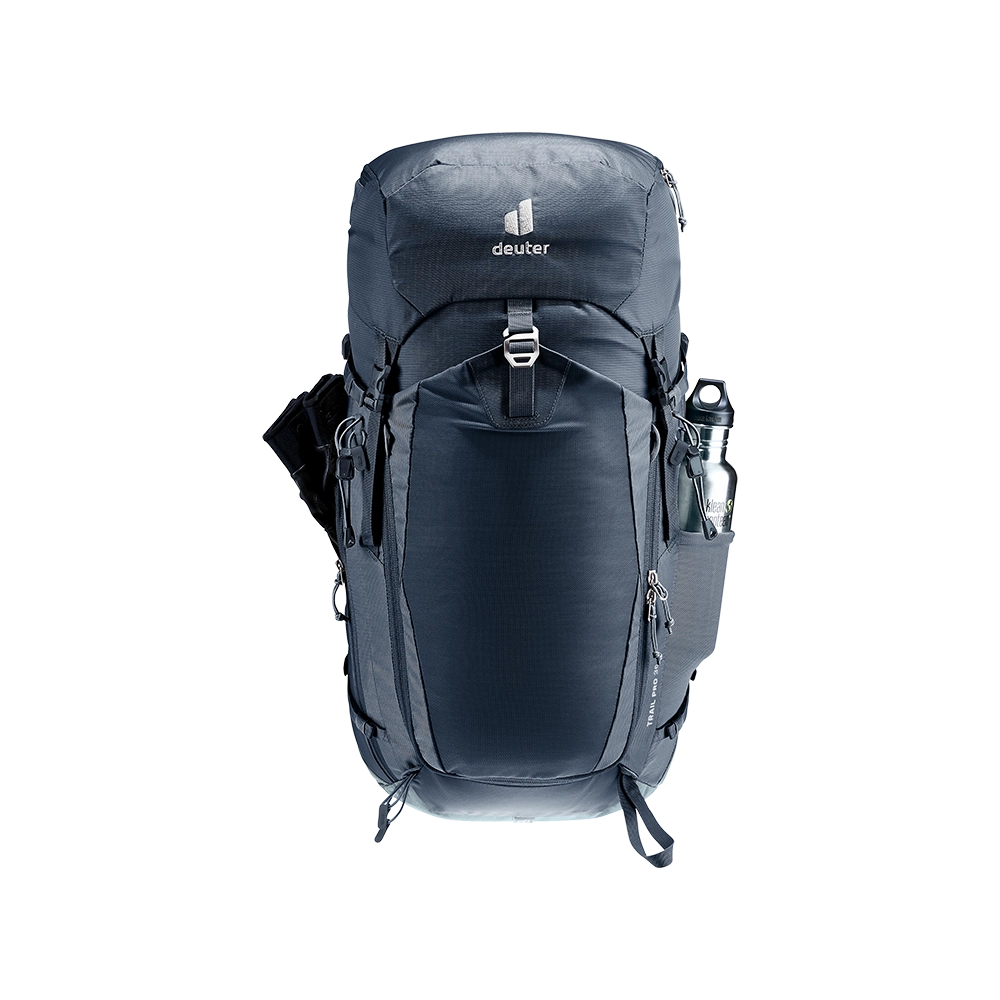Plecak Deuter Trail Pro 36 to idealny towarzysz na kilkudniowe wypady w góry. Posiada jedną komorę, do której dostęp możliwy jest od góry za pomocą klapy oraz od frontu za pomocą dwukierunkowego suwaka. Posiada dużo kieszeni pozwalających właściwie segregować bagaż. W klapie znajdziemy 2 kieszenie zapinane na suwak wewnętrzną oraz zewnętrzną z uchwytem na klucze. Po bokach z jednej strony znajduje się kieszeń zapinana na suwak a z drugiej elastyczna kieszeń z siatki. Z frontu znajduje się kieszeń przeznaczona do transportu kasku lub np. bluzy czy też kurtki. Plecak oferuje również możliwość mocowania kijów trekkingowych oraz czekana. Boczne pasy kompresyjne umożliwiają zmniejszenie pojemności jeżeli istnieje taka potrzeba. Komora główna kompatybilna jest z systemami H2O, posiada przegrodę na umieszczenie bukłaka lub na mokrą odzież.