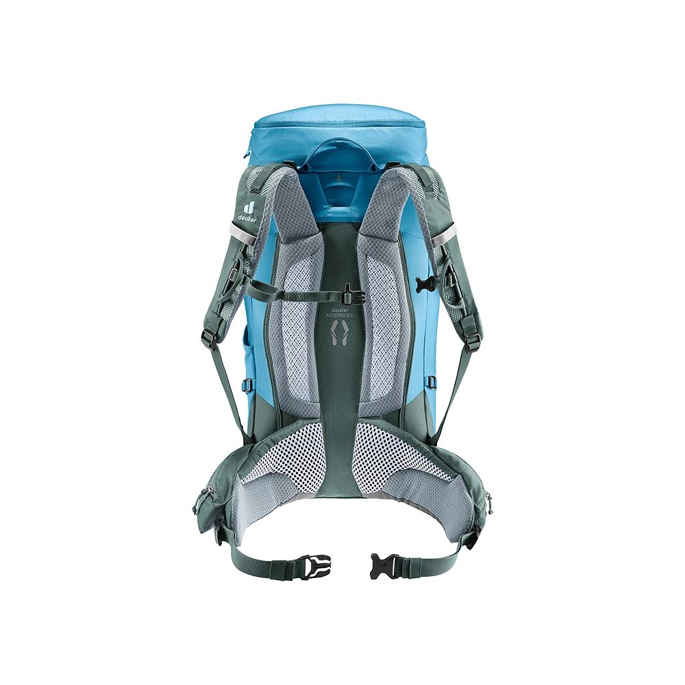 System nośny Deuter Airstripes stanowią dwa rzędy poduszek wypełnionych otwarto-komorową pianką pokrytą od zewnątrz oddychającą siatką Wide AirMesh. Rozwiązanie to zapewnia dobre przyleganie plecaka do pleców oraz zachowuje odpowiedni stopień wentylacji. System nośny dodatkowo napina elastyczny pręt Delrin® pozwalający nosić większe ładunki bez zniekształcenia plecaka. Utrzymuje on plecak bliżej pleców i zapewnia lepsze przenoszenie ciężaru. Elastyczne szelki dopasowują się idealnie do każdej sylwetki. Posiadają płynnie regulowany pas piersiowy, paski regulujące położenie ładunku, elastyczne pętle na rurkę od bukłaka oraz szpejarki. Anatomiczny pas biodrowy posiada nowy sposób regulacji Pull-Forward, poprzez ściągnięcie obu troków przed sobą (taki mechanizm regulacji pasa wymaga zdecydowanie mniej siły przy ściąganiu troków oraz zapewnia precyzyjniejsze dopasowanie go do bioder). Pas biodrowy jest bardzo obszerny i odpowiednio wyprofilowany co zapewnia wysoki komfort i doskonale przenosi obciążenie na biodra. Na pasie znajdują się również dwie kieszenie zapinane na suwak. Plecak wyposażony jest także w uchwyt do przenoszenia lub zawieszania oraz pokrowiec przeciwdeszczowy w jaskrawo zielonym kolorze.