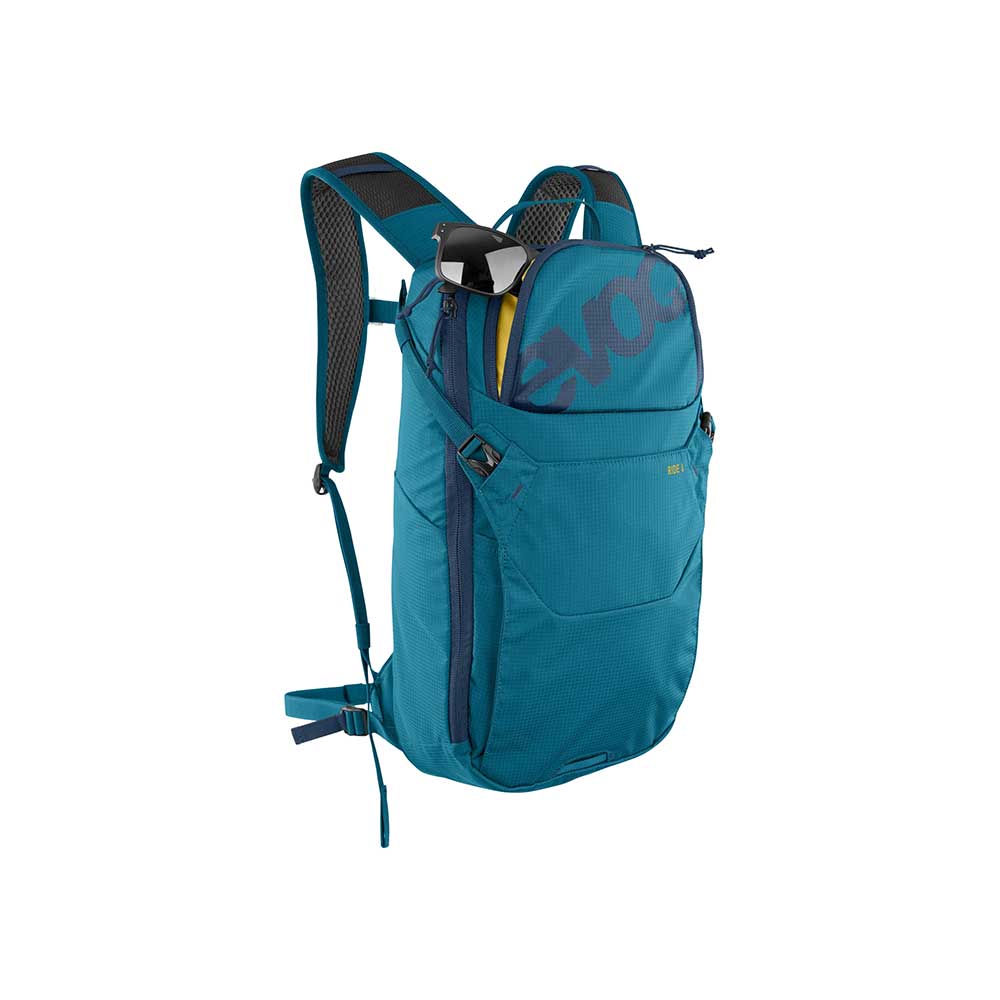 Evoc Ride 8 L jest bardzo uniwersalny, sprawdzi się w trakcie jazdy na rowerze, wyjścia w góry a nawet w trakcie codziennego użytku w mieści.Jego głównym atutem jest bardzo niska waga. Od frontu znajduje się kieszeń na kask oraz mała kieszonka np. na okulary. W komorze głównej znajduje się organizer składający się z dwóch siatkowych kieszeni zapinanych na suwak oraz 2 siatkowych przegródek. Dodatkowo komora główna wyposażona jest w przegrodę dedykowaną na bukłak. System Air Pad oparty jest na wyprofilowanych poduszkach dystansujących co pozwala na ruch powietrza między nimi w trakcie użytkowania. Pas piersiowy jest ruchomy i wyposażony w gwizdek, natomiast pas biodrowy można zdemontować jeżeli nie jest on nam potrzebny. Plecak wyposażony jest również w 2 litrowy bukłak na wodę.