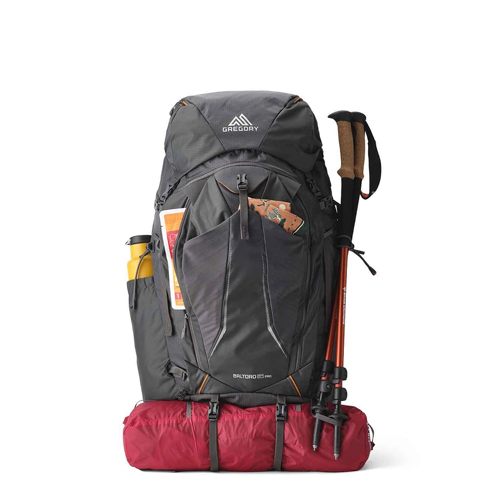 Gregory Baltoro Pro to wzmocniona wersja modelu Baltoro. Zastosowano tu grubszy stelaż oraz poszerzony i wzmocniony pas biodrowy. Dzięki czemu model ten jest przeznaczony do transportu największych ładunków. Największą zaletą tego modelu jest jego system nośny FreeFloat A3. Konstrukcja oparta jest na ramie oraz perforowanej piance opiętej siatką. Rozwiązanie to gwarantuje dobre dopasowanie plecaka do pleców na całej długości przy zachowaniu odpowiedniego stopnia odprowadzania wilgoci. Dodatkowo system ten oferuje możliwość regulacji wysokości położenia pasów nośnych względem pasa biodrowego. Odbywa się to za pomocą przepinania panelu wyposażonego w wytrzymały rzep. Rozwiązanie to pozwala doskonale dopasować plecak do wzrostu i budowy użytkownika. Wykonany został z bardzo lekkich a zarazem wytrzymałych materiałów: Pack Body - 210D 40% Recycled Nylon Ripstop with C0 DWR: Designed without PFAS; Pack Bottom - 420D 40% Recycled Nylon with C0 DWR: Designed without PFAS; Lining - 40% Post-consumer Recycled 135D Polyester with C0 DWR: Designed without PFAS. Od frontu znajduje się elastyczna kieszeń wykonana częściowo z siatki. Po obu stronach znajdują się kieszonki. Jedna z nich dedykowana jest do transportu butelki z wodą. Plecak posiada komorę główną z przegrodą na bukłak lub mokrą odzież (bukłak nie wchodzi w skład zestawu). Komora główna zamykana jest klapą, znajdują się w niej 3 kieszenie zapinane na suwak (dwie zewnętrzne i wewnętrzna). Dodatkowo w wewnętrznej kieszeni ukryty jest pokrowiec przeciwdeszczowy. Dostęp do komory głównej możliwy jest od góry po odpięciu klapy, od frontu za pośrednictwem suwaka w kształcie litery "U" oraz od spodu. Komora główna ma możliwość jej przedzielenia kawałkiem materiału z zaczepami. Od frontu po bokach frontowej kieszeni z siatki znajdują się dwie duże kieszenie zapinane na suwak. Szelki są wentylowane i pokryte perforowanym materiałem. Na szelkach dodatkowo znajdują się paski do montażu rurki od bukłaka lub do troczenia dodatkowego sprzętu oraz specjalnie zaprojektowany uchwyt na okulary. Plecak posiada płynnie regulowany pas piersiowy z wbudowanym gwizdkiem oraz pas biodrowy zintegrowany z konstrukcją systemy nośnego. Zapewnia to doskonałe dopasowanie do bioder oraz odpowiednie przenoszenie obciążeń. Dla poprawy komfortu użytkowania pas biodrowy posiada regulację długości części wyściełanej materiałem. Odbywa się to poprzez odpięcie ukrytych rzepów i wysunięcie lub schowanie ruchomego elementu pasa. Na pasie biodrowym znajdują się dwie kieszonki zapinane na suwak. Boczne troki kompresyjne pozwalają na zmniejszenie pojemności plecaka lub lepszą stabilizację przewożonego ładunku. Dodatkowo model ten umożliwia mocowanie kijów trekkingowych i czekana oraz wyposażony jest w wygodny uchwyt do przenoszenia. Na klapie znajdują się pętle do troczenia dodatkowego ekwipunku a przy dnie dwa troki pozwalające przymocować np. karimatę.