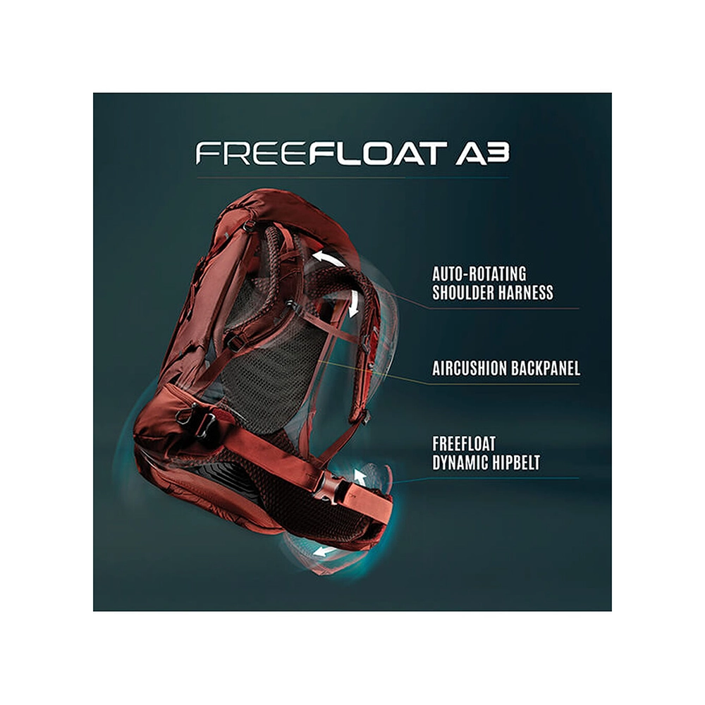 Największą zaletą tego modelu jest jego system nośny FreeFloat A3. Konstrukcja oparta jest na ramie oraz perforowanej piance opiętej siatką. Rozwiązanie to gwarantuje dobre dopasowanie plecaka do pleców na całej długości przy zachowaniu odpowiedniego stopnia odprowadzania wilgoci. Dodatkowo system ten oferuje możliwość regulacji wysokości położenia pasów nośnych względem pasa biodrowego. Odbywa się to za pomocą przepinania panelu wyposażonego w wytrzymały rzep. Rozwiązanie to pozwala doskonale dopasować plecak do wzrostu i budowy użytkownika. Wykonany został z bardzo lekkich a zarazem wytrzymałych materiałów 210D High Density 40% Recycled Nylon With Pfc-free Dwr & 420D High Density 45% Recycled Nylon With Pfc-free Dwr oraz 630D High Density Nylon with PFC-Free DWR. Od frontu znajduje się elastyczna kieszeń wykonana z siatki. Po obu stronach znajdują się kieszonki jedna wykonana z siatki a druga z materiału dedykowana jest ona do transportu butelki z wodą. Plecak posiada komorę główną z przegrodą na bukłak lub mokrą odzież (bukłak nie wchodzi w skład zestawu). Komora główna zamykana jest klapą, znajdują się w niej 3 kieszenie zapinane na suwak (dwie zewnętrzne i wewnętrzna). Dodatkowo w wewnętrznej kieszeni ukryty jest pokrowiec przeciwdeszczowy. Dostęp do komory głównej możliwy jest od góry po odpięciu klapy, od frontu za pośrednictwem suwaka w kształcie litery "U" oraz od spodu. Komora główna ma możliwość jej przedzielenia kawałkiem materiału z zaczepami. Od frontu po bokach frontowej kieszeni z siatki znajdują się dwie duże kieszenie zapinane na suwak. Szelki są wentylowane i pokryte perforowanym materiałem. Na szelkach dodatkowo znajdują się paski do montażu rurki od bukłaka lub do troczenia dodatkowego sprzętu oraz specjalnie zaprojektowany uchwyt na okulary. Plecak posiada płynnie regulowany pas piersiowy z wbudowanym gwizdkiem oraz pas biodrowy zintegrowany z konstrukcją systemy nośnego. Zapewnia to doskonałe dopasowanie do bioder oraz odpowiednie przenoszenie obciążeń. Dla poprawy komfortu użytkowania pas biodrowy posiada regulację długości części wyściełanej materiałem. Odbywa się to poprzez odpięcie ukrytych rzepów i wysunięcie lub schowanie ruchomego elementu pasa. Na pasie biodrowym znajdują się dwie kieszonki zapinane na suwak. Boczne troki kompresyjne pozwalają na zmniejszenie pojemności plecaka lub lepszą stabilizację przewożonego ładunku. Dodatkowo model ten umożliwia mocowanie kijów trekkingowych i czekana oraz wyposażony jest w wygodny uchwyt do przenoszenia. Na klapie znajdują się pętle do troczenia dodatkowego ekwipunku a przy dnie dwa troki pozwalające przymocować np. karimatę.