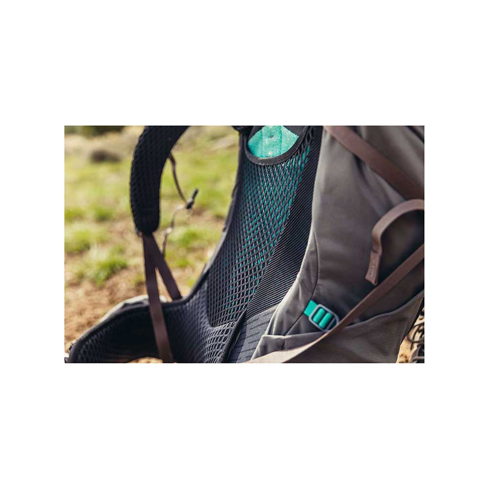 Największą zaletą tego modelu jest jego system nośny FreeFloat. Konstrukcja oparta jest na odpowiednio wygiętej ramie oraz napiętej na niej siatce. Rozwiązanie to gwarantuje doskonałą wentylację pleców oraz szybkie ich wysychanie nawet po dużym wysiłku. Dodatkowo system ten oferuje możliwość regulacji wysokości położenia pasów nośnych względem pasa biodrowego. Odbywa się to za pomocą przepinania panelu wyposażonego w wytrzymały rzep. Rozwiązanie to pozwala doskonale dopasować plecak do wzrostu i budowy użytkownika. Wykonany został z bardzo lekkich a zarazem wytrzymałych materiałów 40% Recycled 400D Polyester Ripstop with PFC-Free DWR oraz 420D NYLON WITH PFC-FREE DWR. Od frontu znajduje się elastyczna kieszeń wykonana z połączenia wytrzymałej siatki i materiału. Po obu stronach znajdują się siateczkowe kieszonki w sam raz do transportu butelek z wodą. Plecak posiada komorę główną z przegrodą na bukłak lub mokrą odzież (bukłak nie wchodzi w skład zestawu). Komora główna zapinana jest na suwak. W komorze głównej znajduje się kieszonka zapinana na suwak z ukrytym pokrowcem przeciwdeszczowym. Od frontu na szczycie znajduje się dodatkowa niewielka kieszeń zapinana suwakiem na najpotrzebniejsze drobiazgi. Szelki są wentylowane i pokryte perforowanym materiałem. Na szelkach dodatkowo znajdują się paski do montażu rurki od bukłaka lub do troczenia dodatkowego sprzętu. Plecak posiada płynnie regulowany pas piersiowy z wbudowanym gwizdkiem oraz pas biodrowy zintegrowany z konstrukcją systemy nośnego. Zapewnia to doskonałe dopasowanie do bioder oraz odpowiednie przenoszenie obciążeń. Na pasie biodrowym znajdują się dwie kieszonki zapinane na suwak. Boczne troki kompresyjne pozwalają na zmniejszenie pojemności plecaka lub lepszą stabilizację przewożonego ładunku. Dodatkowo model ten umożliwia mocowanie kijów trekkingowych oraz wyposażony jest w wygodny uchwyt do przenoszenia.