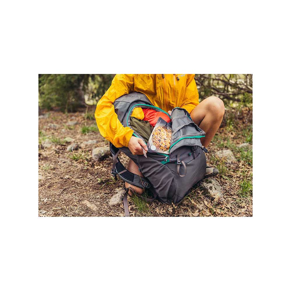 Największą zaletą tego modelu jest jego system nośny FreeFloat. Konstrukcja oparta jest na odpowiednio wygiętej ramie oraz napiętej na niej siatce. Rozwiązanie to gwarantuje doskonałą wentylację pleców oraz szybkie ich wysychanie nawet po dużym wysiłku. Dodatkowo system ten oferuje możliwość regulacji wysokości położenia pasów nośnych względem pasa biodrowego (zakres regulacji: 9 cm). Odbywa się to za pomocą przepinania panelu wyposażonego w wytrzymały rzep. Rozwiązanie to pozwala doskonale dopasować plecak do wzrostu i budowy użytkownika. Wykonany został z bardzo lekkich a zarazem wytrzymałych materiałów 40% Recycled 400D Polyester Ripstop with PFC-Free DWR oraz 420D NYLON WITH PFC-FREE DWR. Od frontu znajduje się elastyczna kieszeń wykonana z połączenia wytrzymałej siatki i materiału. Po obu stronach znajdują się siateczkowe kieszonki w sam raz do transportu butelek z wodą. Plecak posiada komorę główną z przegrodą na bukłak lub mokrą odzież (bukłak nie wchodzi w skład zestawu). Komora główna zamykana jest klapą, znajdują się w niej 2 kieszenie zapinane na suwak (zewnętrzna i wewnętrzna). Dodatkowo w wewnętrznej kieszeni ukryty jest pokrowiec przeciwdeszczowy. Dostęp do komory głównej możliwy jest od góry po odpięciu klapy oraz od frontu za pośrednictwem wszytego suwaka w kształcie litery "U". Szelki są wentylowane i pokryte perforowanym materiałem. Na szelkach dodatkowo znajdują się paski do montażu rurki od bukłaka lub do troczenia dodatkowego sprzętu. Plecak posiada płynnie regulowany pas piersiowy z wbudowanym gwizdkiem oraz pas biodrowy zintegrowany z konstrukcją systemy nośnego. Zapewnia to doskonałe dopasowanie do bioder oraz odpowiednie przenoszenie obciążeń. Na pasie biodrowym znajdują się dwie kieszonki zapinane na suwak. Boczne troki kompresyjne pozwalają na zmniejszenie pojemności plecaka lub lepszą stabilizację przewożonego ładunku. Dodatkowo model ten umożliwia mocowanie kijów trekkingowych oraz wyposażony jest w wygodny uchwyt do przenoszenia.