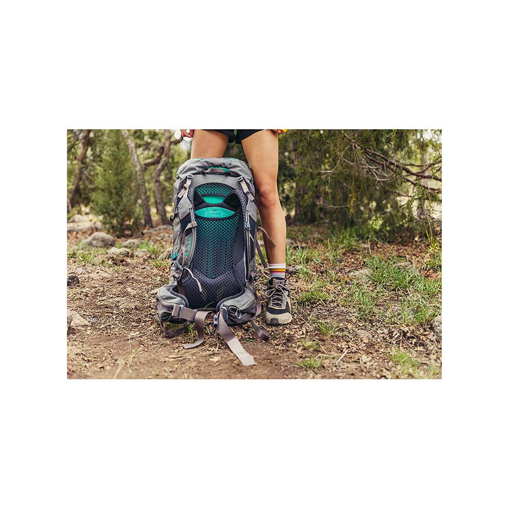 Największą zaletą tego modelu jest jego system nośny FreeFloat. Konstrukcja oparta jest na odpowiednio wygiętej ramie oraz napiętej na niej siatce. Rozwiązanie to gwarantuje doskonałą wentylację pleców oraz szybkie ich wysychanie nawet po dużym wysiłku. Dodatkowo system ten oferuje możliwość regulacji wysokości położenia pasów nośnych względem pasa biodrowego. Odbywa się to za pomocą przepinania panelu wyposażonego w wytrzymały rzep. Rozwiązanie to pozwala doskonale dopasować plecak do wzrostu i budowy użytkownika. Wykonany został z bardzo lekkich a zarazem wytrzymałych materiałów 40% Recycled 400D Polyester Ripstop with PFC-Free DWR oraz 420D NYLON WITH PFC-FREE DWR. Od frontu znajduje się elastyczna kieszeń wykonana z połączenia wytrzymałej siatki i materiału. Po obu stronach znajdują się siateczkowe kieszonki w sam raz do transportu butelek z wodą. Plecak posiada komorę główną z przegrodą na bukłak lub mokrą odzież (bukłak nie wchodzi w skład zestawu). Komora główna zamykana jest klapą, znajdują się w niej 2 kieszenie zapinane na suwak (zewnętrzna i wewnętrzna). Dodatkowo w wewnętrznej kieszeni ukryty jest pokrowiec przeciwdeszczowy. Dostęp do komory głównej możliwy jest od góry po odpięciu klapy oraz od frontu za pośrednictwem wszytego suwaka w kształcie litery "U". Szelki są wentylowane i pokryte perforowanym materiałem. Na szelkach dodatkowo znajdują się paski do montażu rurki od bukłaka lub do troczenia dodatkowego sprzętu. Plecak posiada płynnie regulowany pas piersiowy z wbudowanym gwizdkiem oraz pas biodrowy zintegrowany z konstrukcją systemy nośnego. Zapewnia to doskonałe dopasowanie do bioder oraz odpowiednie przenoszenie obciążeń. Na pasie biodrowym znajdują się dwie kieszonki zapinane na suwak. Boczne troki kompresyjne pozwalają na zmniejszenie pojemności plecaka lub lepszą stabilizację przewożonego ładunku. Dodatkowo model ten umożliwia mocowanie kijów trekkingowych oraz wyposażony jest w wygodny uchwyt do przenoszenia.