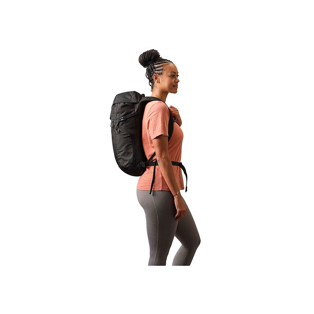 Wykonany został z bardzo lekkich a zarazem wytrzymałych materiałów szkielet/korpus z 210D High Density 40% Recycled Nylon natomiast spód/dno z 450D 100% recycled Polyester with C0 DWR: Designed without PFAS. Po obu stronach znajdują się kieszenie, jedna z siatki w sam raz do transportu butelki z wodą a z drugiej strony zapinana na suwak. Dodatkowo na froncie znajdują się uchwyt na kije trekkingowe oraz pętelki umożliwiające dodatkowe troczenie ekwipunku. Dostęp do komory głównej jest z pomocą klapy. Sama komora główna dodatkowo zabezpieczona jest linką ze stoperem. Po odpięciu klapy w tylnej części plecaka znajduje się dodatkowa komora zapinana na suwak. Jest ona dedykowana do transportu systemu nawodnienia (nie jest w zestawie) lub do transportu laptopa. Znajduje się w niej uchwyt do podczepienie bukłaka. Od zewnętrznej strony klapy znajduje się kieszeń na najpotrzebniejsze drobiazgi. Plecy plecaka są delikatnie usztywniane pokryte miękką perforowaną pianką CLPE Foam. Szelki również wykonane są z tej samej pianki dodatkowo od wewnątrz pokryte zostały miękkim materiałem, są one również wentylowane. Na szelkach dodatkowo znajdują się paski do montażu rurki od bukłaka lub do troczenia dodatkowego sprzętu. Plecak posiada regulowany pas piersiowy z wbudowanym gwizdkiem oraz pas biodrowy który w razie potrzeby można zdemontować. Po bokach znajdują się jeszcze troki kompresyjne pozwalające na zmniejszenie pojemności plecaka lub lepszą stabilizację przewożonego ładunku. Na samym szczycie znajduje się wygodny uchwyt do przenoszenia.