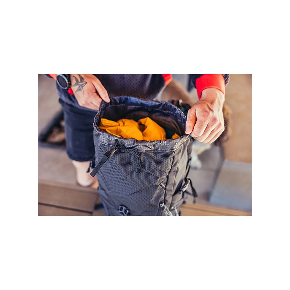 Wykonany został z bardzo lekkich a zarazem wytrzymałych materiałów szkielet/korpus z 210D High Density 40% Recycled Nylon natomiast spód/dno z 450D 100% recycled Polyester with C0 DWR: Designed without PFAS. Po obu stronach znajdują się kieszenie, jedna z siatki w sam raz do transportu butelki z wodą a z drugiej strony zapinana na suwak. Dodatkowo na froncie znajdują się uchwyt na kije trekkingowe oraz pętelki umożliwiające dodatkowe troczenie ekwipunku. Dostęp do komory głównej jest z pomocą klapy. Sama komora główna dodatkowo zabezpieczona jest linką ze stoperem. Po odpięciu klapy w tylnej części plecaka znajduje się dodatkowa komora zapinana na suwak. Jest ona dedykowana do transportu systemu nawodnienia (nie jest w zestawie) lub do transportu laptopa. Znajduje się w niej uchwyt do podczepienie bukłaka. Od zewnętrznej strony klapy znajduje się kieszeń na najpotrzebniejsze drobiazgi. Plecy plecaka są delikatnie usztywniane pokryte miękką perforowaną pianką CLPE Foam. Szelki również wykonane są z tej samej pianki dodatkowo od wewnątrz pokryte zostały miękkim materiałem, są one również wentylowane. Na szelkach dodatkowo znajdują się paski do montażu rurki od bukłaka lub do troczenia dodatkowego sprzętu. Plecak posiada regulowany pas piersiowy z wbudowanym gwizdkiem oraz pas biodrowy który w razie potrzeby można zdemontować. Po bokach znajdują się jeszcze troki kompresyjne pozwalające na zmniejszenie pojemności plecaka lub lepszą stabilizację przewożonego ładunku. Na samym szczycie znajduje się wygodny uchwyt do przenoszenia.