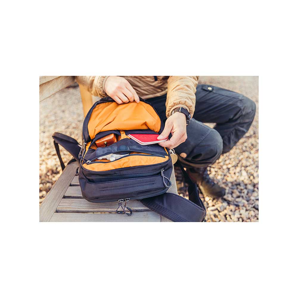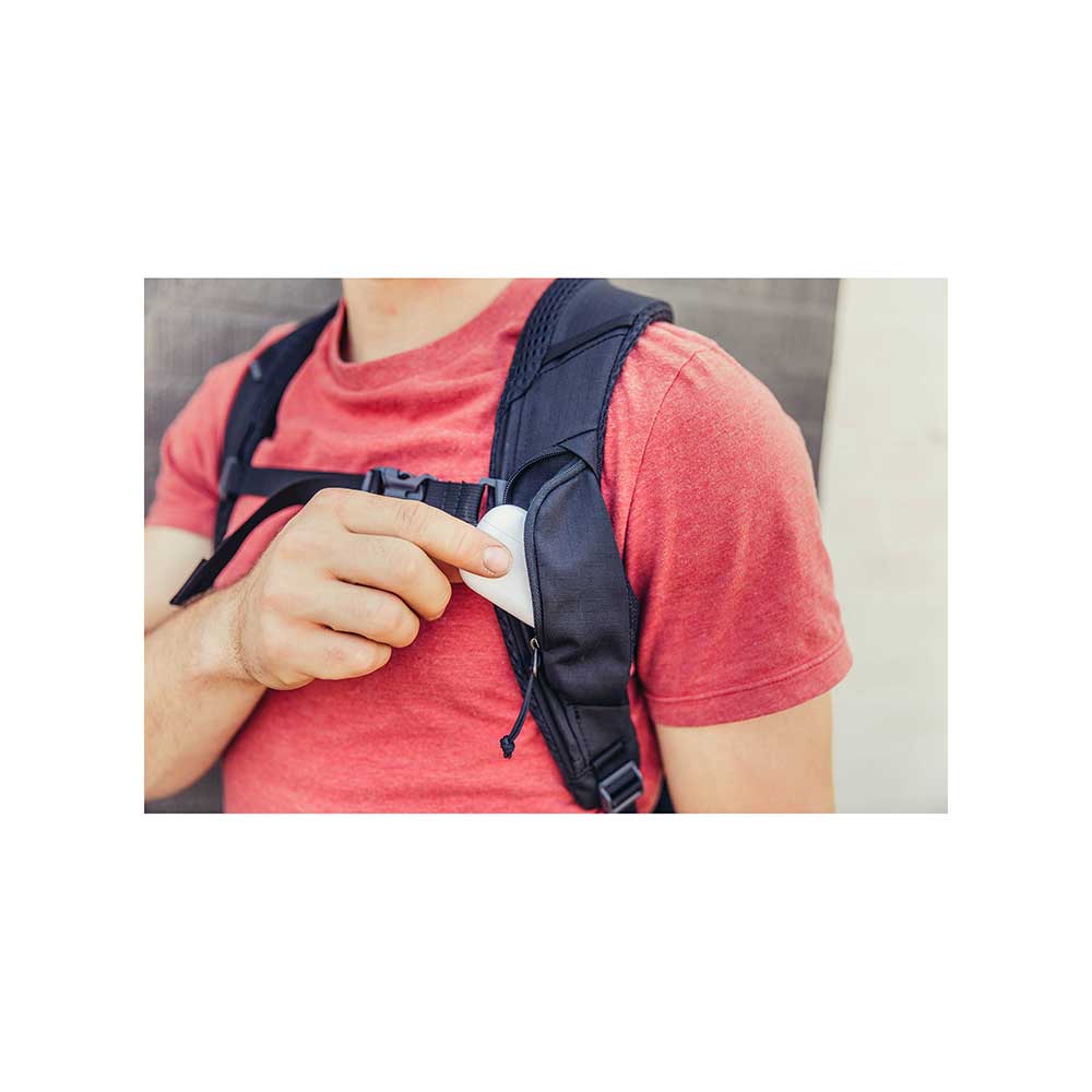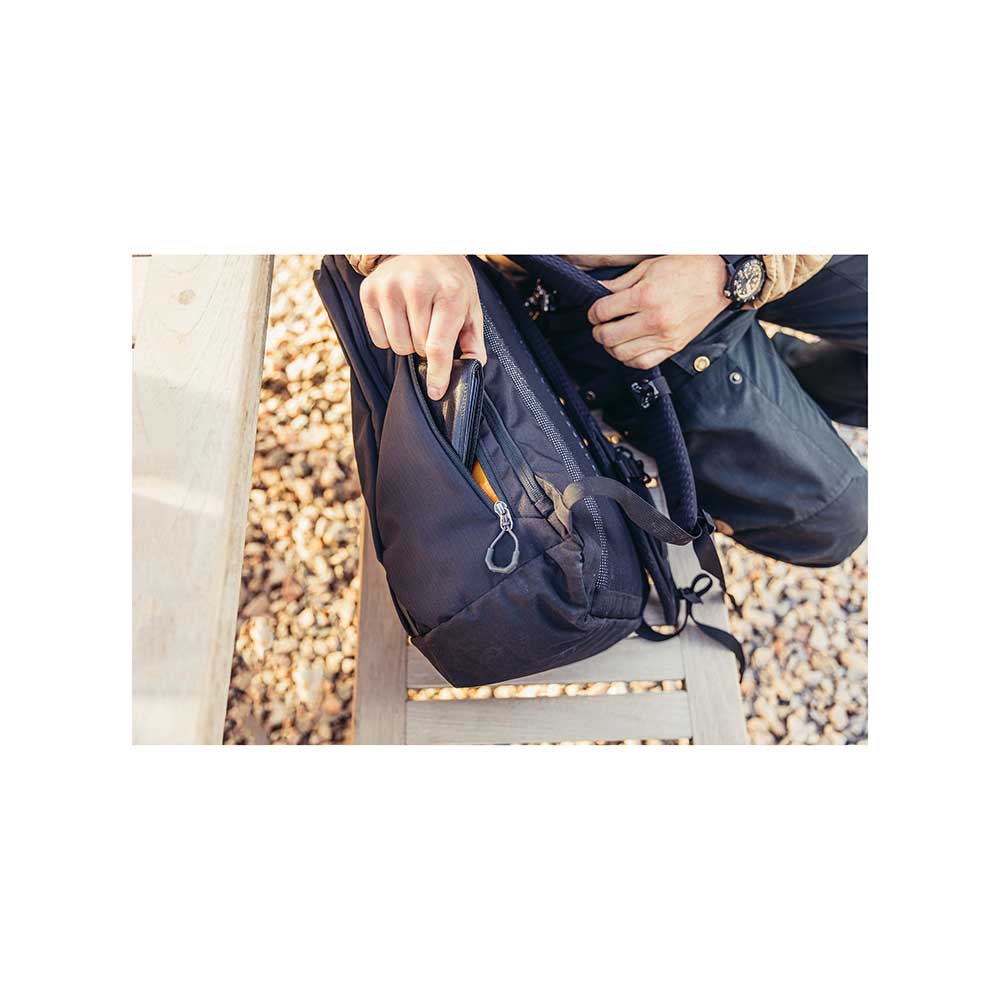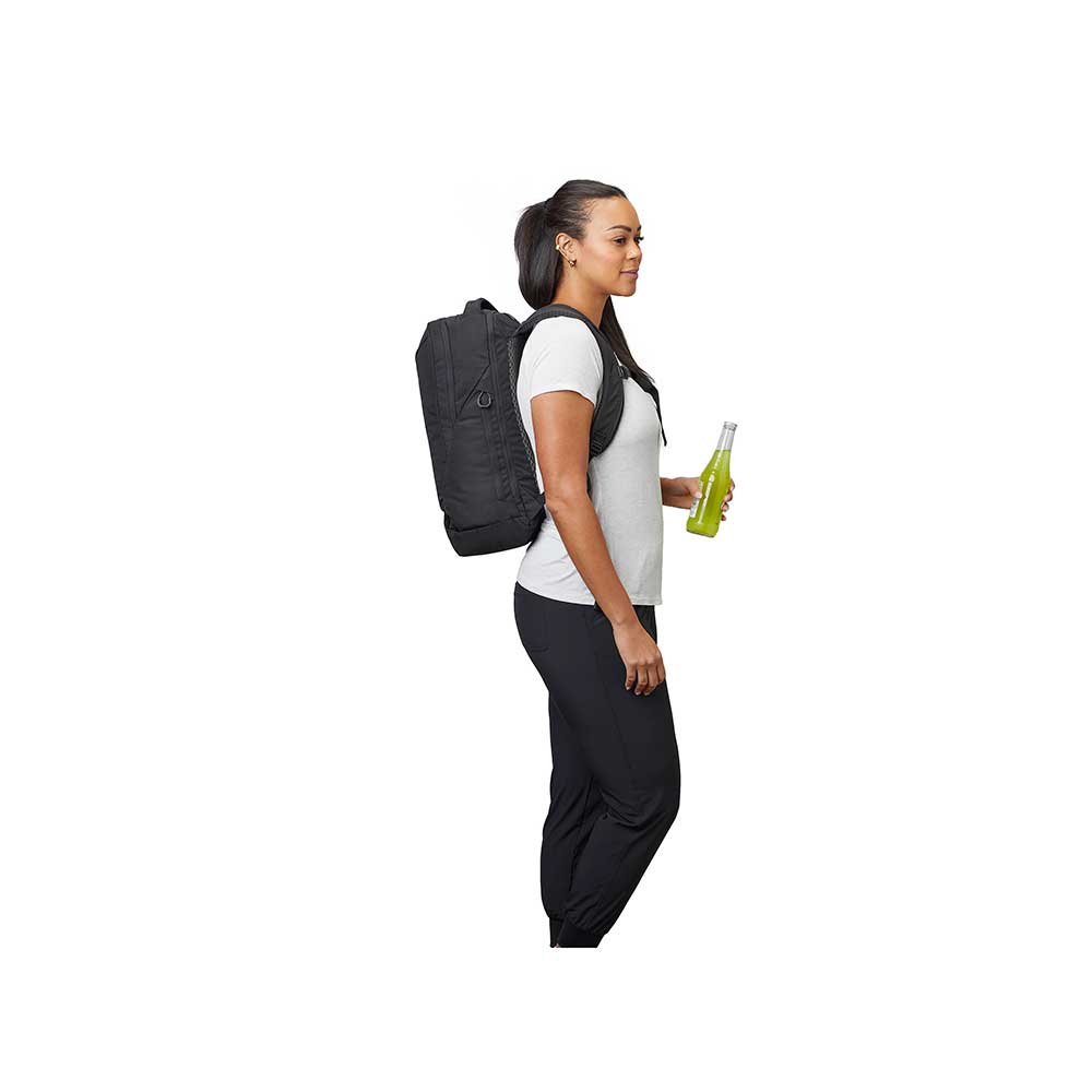 Wykonany został z bardzo lekkich a zarazem wytrzymałych materiałów pochodzących z recyclingu 100% Recycled 300D Polyester Ripstop with PFC-Free DWR. Od frontu znajduje się duża kieszeń z dostępem za pośrednictwem suwaka. W jej wnętrzu znajdują się 2 przegródki z siatki oraz kieszeń z siatki zasuwana na suwak. Na szczycie znajduje się również mniejsza kieszonka zapinana na suwak. Przy spodzie plecaka wszyte są dwie pętle do troczenia dodatkowego ekwipunku z odblaskowymi akcentami. Po bokach z jednej strony znajduje się elastyczna kieszeń z siatki w sam raz do transportu butelki z wodą a po drugiej stronie mała kieszeń zapinana na suwak z ukrytym uchwytem na klucze. W komorze głównej znajduje się niewielka siateczkowa kieszonka zapinana na suwak oraz uchwyty na przybory do pisania np. długopisy, ołówki. W komorze głównej znajdują się również przegrody dedykowane do transportu laptopa do 15" oraz tabletu. Szelki wykonano z pianki i pokryto oddychającym materiałem. Na szelkach dodatkowo znajdują się paski do troczenia dodatkowego sprzętu. Plecak posiada płynnie regulowany pas piersiowy oraz niewielką kieszonkę zapinaną na suwak na jednej z szelek. Dodatkowo model ten wyposażony jest w wygodny uchwyt do przenoszenia.