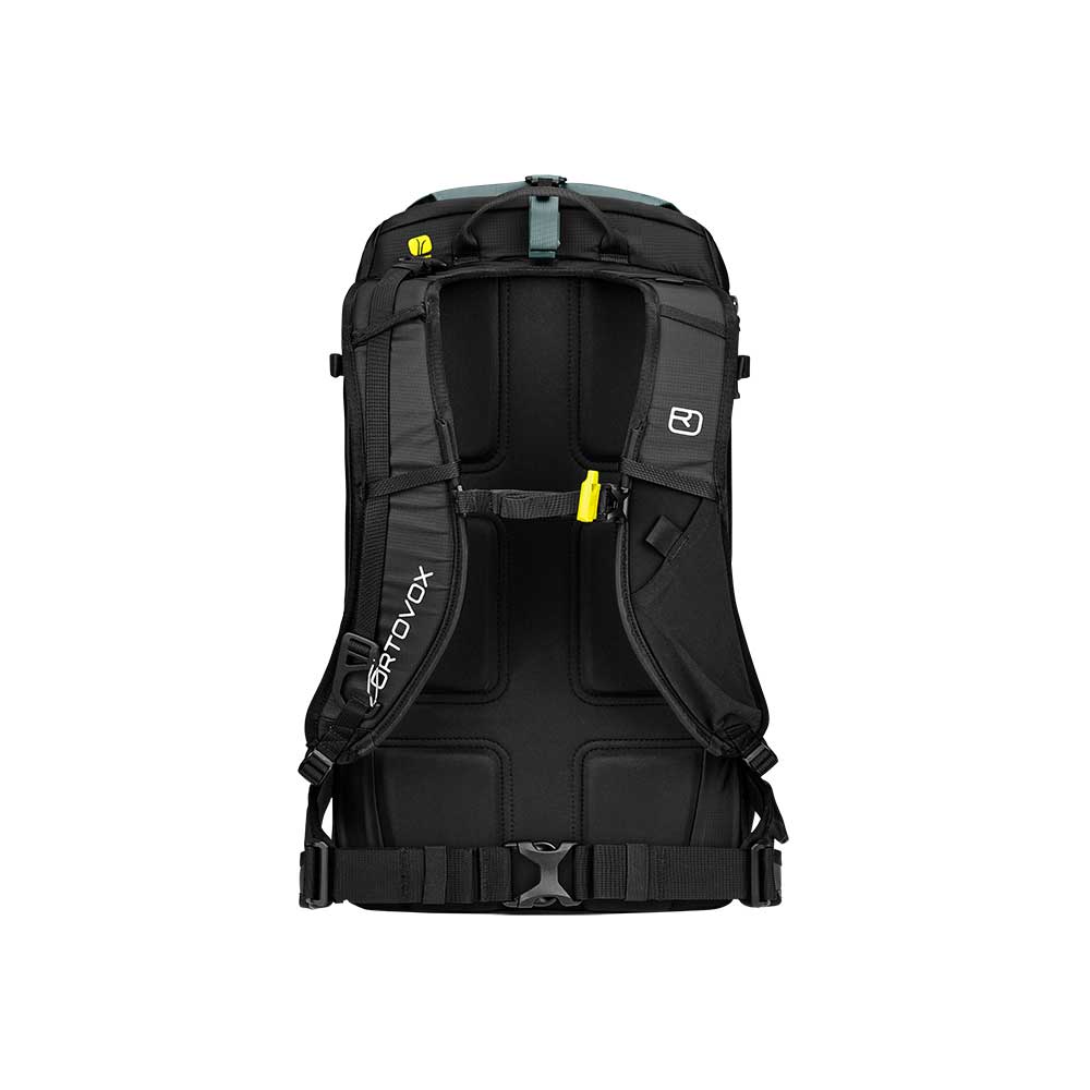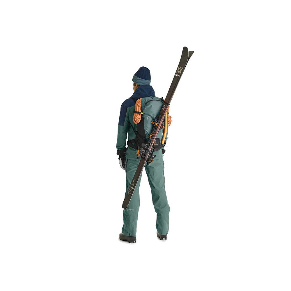 Ortovox Ravine przeznaczony jest dla wymagających freeriderów dla których łatwy dostęp do najpotrzebniejszego sprzętu jest kwestią kluczową. Jedną z największych zalet tego modelu jest możliwość mocowania nart na 3 sposoby. Tradycyjne A-Skifix, D-Skifix oraz unikalna metoda podobna do mocowania D-Skifix ale umożliwiająca ale umożliwiająca mocowania jaki i demontaż nart w trakcie noszenia. Zwiększa to bezpieczeństwo oraz przyspiesza poruszanie się do docelowego miejsca. Klapa plecaka zamykana jest specjalnie zaprojektowaną klamrą aby łatwiej można było się dostać do komory głównej. Komora główna dzielona jest na 3 przegrody. Przegrodę dedykowaną do transportu ABC lawinowego, część ładunkową główną oraz przegrodę do montażu ochraniacza kręgosłupa Clasp Spine Protector (nie wchodzi w skład zestawu - należy dokupić go oddzielnie). Komora główna jest dzielona od spodu zamknięciem na suwak. Do komory głównej mamy możliwość dostępu od góry po odpięciu klapy, od boku za pośrednictwem suwaka oraz od dołu poprzez specjalnie zaprojektowaną kieszeń z szybkim dostępem. Kieszeń ta stanowi dolną cześć komory głównej i możemy w niej transportować np. raki, foki czy też butelkę z wodą. Od frontu znajduje się kieszeń na mapę z ukrytym wewnątrz uchwytem na klucze. Na klapie znajduje się dodatkowa kieszeń na najpotrzebniejsze drobiazgi. W środku schowana jest siatka do mocowania kasku. Umożliwia on mocowanie i dostęp do czekanu bez konieczności zdejmowania plecaka. Kompatybilny jest z systemami nawodnienia, na jednej z szelek posiada niewielką elastyczną kieszonkę na drobne przekąski a na pasie biodrowym szpejarkę. Umożliwia transport liny, ma płynnie regulowany pas piersiowy z gwizdkiem oraz emergency card z krótką instrukcją S.O.S. oraz miejscem na najpotrzebniejsze informacje o użytkowniku.