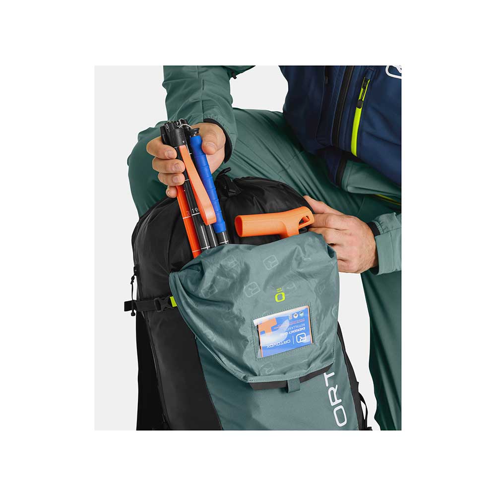 Ortovox Ravine przeznaczony jest dla wymagających freeriderów dla których łatwy dostęp do najpotrzebniejszego sprzętu jest kwestią kluczową. Jedną z największych zalet tego modelu jest możliwość mocowania nart na 3 sposoby. Tradycyjne A-Skifix, D-Skifix oraz unikalna metoda podobna do mocowania D-Skifix ale umożliwiająca ale umożliwiająca mocowania jaki i demontaż nart w trakcie noszenia. Zwiększa to bezpieczeństwo oraz przyspiesza poruszanie się do docelowego miejsca. Klapa plecaka zamykana jest specjalnie zaprojektowaną klamrą aby łatwiej można było się dostać do komory głównej. Komora główna dzielona jest na 3 przegrody. Przegrodę dedykowaną do transportu ABC lawinowego, część ładunkową główną oraz przegrodę do montażu ochraniacza kręgosłupa Clasp Spine Protector (nie wchodzi w skład zestawu - należy dokupić go oddzielnie). Komora główna jest dzielona od spodu zamknięciem na suwak. Do komory głównej mamy możliwość dostępu od góry po odpięciu klapy, od boku za pośrednictwem suwaka oraz od dołu poprzez specjalnie zaprojektowaną kieszeń z szybkim dostępem. Kieszeń ta stanowi dolną cześć komory głównej i możemy w niej transportować np. raki, foki czy też butelkę z wodą. Od frontu znajduje się kieszeń na mapę z ukrytym wewnątrz uchwytem na klucze. Na klapie znajduje się dodatkowa kieszeń na najpotrzebniejsze drobiazgi. W środku schowana jest siatka do mocowania kasku. Umożliwia on mocowanie i dostęp do czekanu bez konieczności zdejmowania plecaka. Kompatybilny jest z systemami nawodnienia, na jednej z szelek posiada niewielką elastyczną kieszonkę na drobne przekąski a na pasie biodrowym szpejarkę. Umożliwia transport liny, ma płynnie regulowany pas piersiowy z gwizdkiem oraz emergency card z krótką instrukcją S.O.S. oraz miejscem na najpotrzebniejsze informacje o użytkowniku.