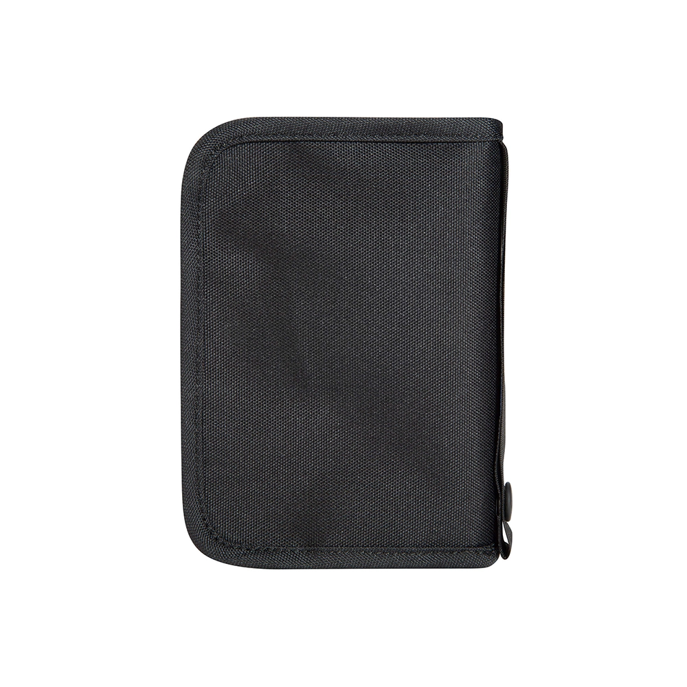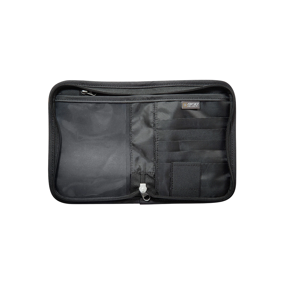 Ten pojemny portfel pomieści twoje karty, gotówkę, dokumenty a nawet paszport. Posiada dwie duże płaskie kieszenie, w tym jedna zapinana na suwak, które sprawdzą się na banknoty i monety, dwie średnie przegródki, w tym jedna stanowi przezroczystą przegrodę na jeden paszport (UE) oraz pięć przegródek na karty, dokumenty itp. Kieszeń na karty ma również dodatkową przegrodę na kartę pamięci. Portfel ma także zewnętrzną taśmę zapinaną na nap, umożliwiającą przypięcie go do innego bagażu bądź służącą jako uchwyt do transportu. Cała zawartość będzie bezpieczna dzięki wbudowanej folii Cryptalloy®, blokującej fale radiowe wszystkich komercyjnych częstotliwości używanych do odczytu danych. Folia ta zapewnia maksymalne ekranowanie i zakłóca wszelką komunikację radiową. System ten został przetestowany i certyfikowany przez niemiecką jednostkę certyfikującą TÜV Saarland.