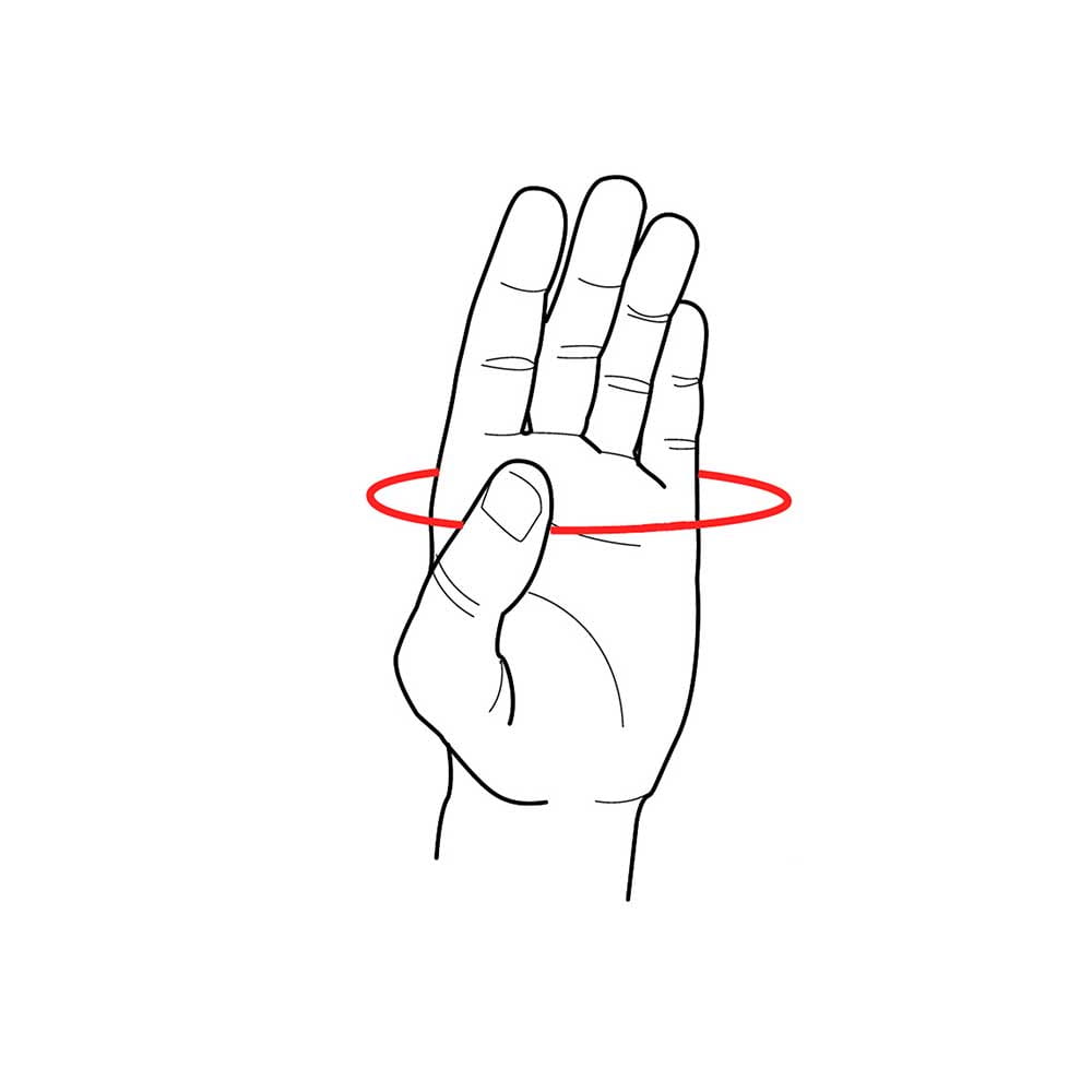 Prawidłowy pomiar dłoni polega na zmierzeniu obwodu na wysokości kostek czterech palców zgodnie z załączonym obrazkiem. W przypadku wahania między różnymi rozmiarami, sugerujemy wybór większego, aby dłoń miała więcej luzu.