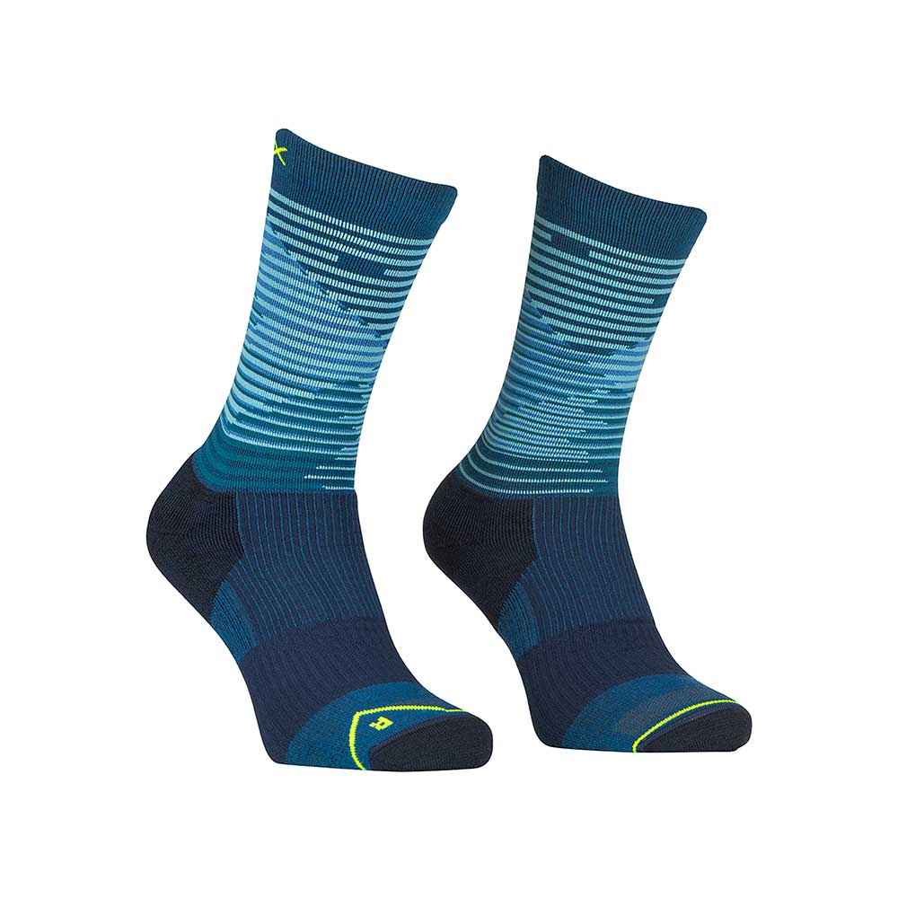 Podczas długich wypraw górskich w zmiennych warunkach pogodowych skarpety te zapewnią odpowiedni komfort termiczny i wilgotnościowy stóp. Zastosowana delikatna wełna merynosowa o grubości 21,5 mikrona jest przyjemna dla skóry, sprawia, że skarpetki są elastyczne i stabilne. Właściwości wełny Merino to również zapewnienie odpowiedniej wentylacji a także neutralizacja nieprzyjemnych zapachów. Bezszwowa konstrukcja sprawia, że unikniemy obtarć i pęcherzy spowodowanych przez uciski lub zagniecenia skarpety w bucie. Poszczególne strefy skarpety są tak zaprojektowane, aby zapewnić maksymalny komfort. Wzmocnienia strefy pięt i palców zapewniają dodatkową amortyzację i chronią przed otarciami. Ergonomiczny krój oraz stabilizujący pas w strefie ściągacza zapobiegnie zsuwaniu się skarpet. Wersja Mid to średniej wysokości skarpety za kostkę, które sprawdzą się do klasycznych butów podejściowych. Polecane na zmienne i chłodne warunki pogodowe np. w przejściowych okresach wiosenno czy jesienno-zimowych. Skarpety Ortovox All Mountain Mid Socks będą idealnym rozwiązaniem dla entuzjastów outdooru, którzy pokonują długie dystanse przez cały rok. Niewątpliwą zaletą jest również nowoczesny i wesoły design, który nie pozostanie niezauważony na szlaku.