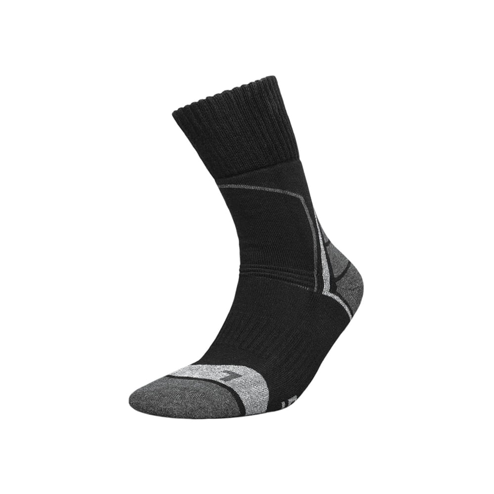 Trójwarstwowe profilowane wewnętrzne frotte amortyzujące wstrząsy i chroniące wrażliwe części stopy oraz kostki przed otarciami i urazami. Skarpetki dostosowane do anatomicznego kształtu lewej (L) i prawej (R) stopy nie tylko przez odpowiednie wyprofilowanie frotte, ale i ukształtowanie innego konturu dzianiny wokół palców lewej i prawej stopy. Lycra® w całym wyrobie zapewnia znakomite przyleganie do nogi. Dłuższą, bezuciskową cholewkę o specjalnej konstrukcji można wywijać na but. Opaska elastyczna na śródstopiu zabezpiecza przed przesuwaniem się skarpetki na stopie. Odpowiednio wyprofilowana dzianina na pięcie (kształt "Y"), doskonale przylega do stopy i stabilizuje ją. Poprzeczne prążki ułatwiają układanie się skarpetki na zgięciu nogi. Nieprzenosząca obciążeń część skarpetki nad stopą jest cieńsza, co wraz z kanałami wentylacyjnymi wzdłuż skarpetki przyspiesza odprowadzanie wilgoci. Komfortu dopełnia płaski miękki szew "Rosso" nad palcami i wywietrznik pod palcami. Właściwości antybakteryjne, antygrzybicze i antyzapachowe zapewnia apretura Sanitized®.