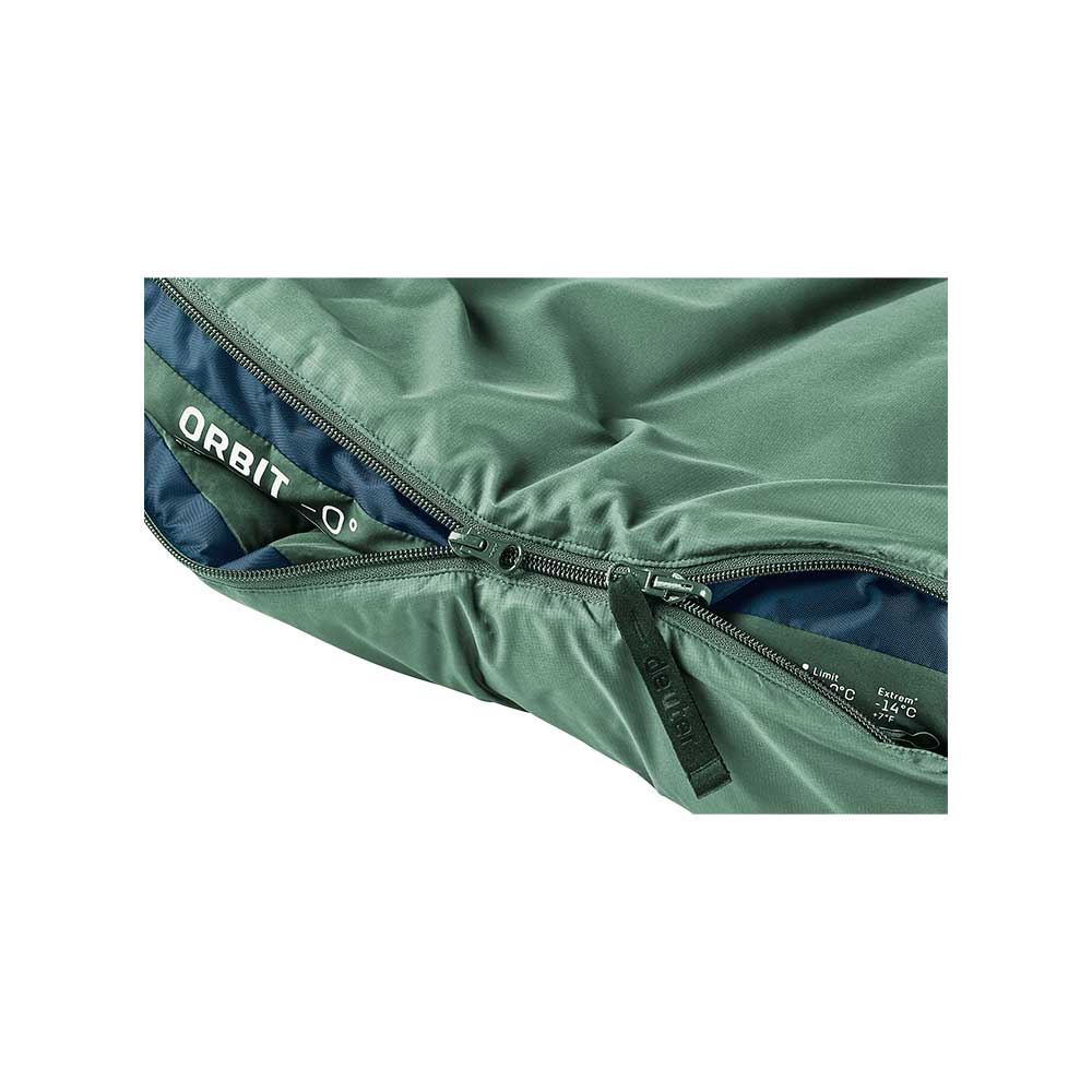Śpiwór Orbit 0 z kolekcji Deuter wykonany jest z nowoczesnych materiałów, gwarantujących niesamowitą wytrzymałość i trwałość. Tkanina zewnętrzna 50D REC PES Ripstop chroni przed zawilgoceniem i brudem. Śpiwór jest wolny od PFC. Konstrukcja śpiwora jest jednowarstwowa dlatego nie ma możliwości wyeliminowania "zimnych punktów", stąd najlepiej jest go używać w ciepłą część roku. Wewnątrz znajduje się mała kieszonka a przestrzeń przeznaczona na stopy jest specjalnie zaprojektowana aby zwiększyć swobodę ruchów a tym samym komfort. Śpiwór wyposażony jest również w kołnierz termiczny co podnosi dodatkowo komfort. Model ten ma możliwość spinania 2 śpiworów z zamkami lewy z prawym.