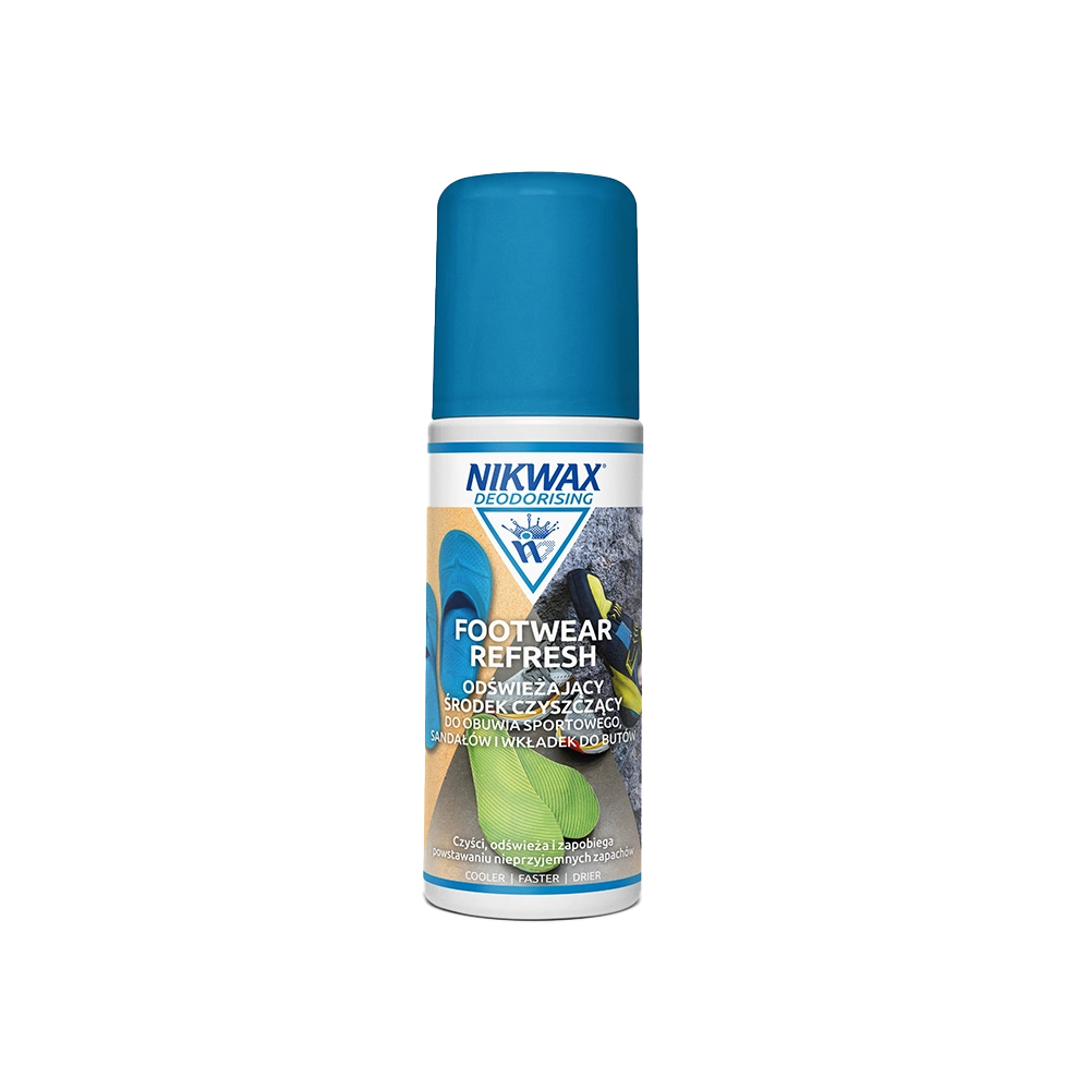Nikwax Footwear Refresh to specjalistyczny środek czyszczący i odświeżający do obuwia sportowego, sandałów oraz wkładek do butów. Idealnie sprawdzi się u osób aktywnych – biegaczy, turystów, wspinaczy czy miłośników fitnessu – wszędzie tam, gdzie intensywne użytkowanie obuwia prowadzi do powstawania zabrudzeń i nieprzyjemnych zapachów. Preparat skutecznie usuwa źródła przykrych woni, poprawia higienę i pomaga przedłużyć żywotność butów, jednocześnie będąc bezpiecznym dla skóry i środowiska. Dzięki wygodnemu atomizerowi aplikacja jest szybka i bezproblemowa – zarówno w domu, jak i w podróży.