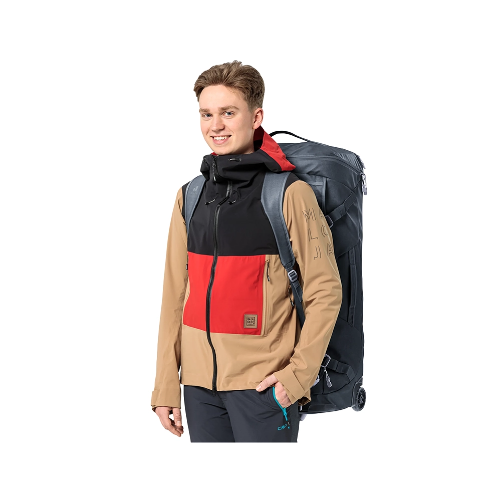Na spodzie posiada 2 wytrzymałe kółka i podstawkę która może służyć jako dodatkowy uchwyt. Wyposażona jest w chowane szelki dopinane do klamer znajdujących się na froncie, dzięki czemu w jednej chwili można założyć ją na plecy. Szelki chowane są one we frontowej kieszeni zapinanej na suwak. Posiada też dwa uchwyty do przenoszenia oraz teleskopową rączkę do prowadzenia ukrytą w specjalnej kieszonce. Sztywna podstawa ze stelażem, na wytrzymałych kółkach, sprawiają że może posłużyć również jako walizka. Dostęp do komory głównej otrzymujemy za pośrednictwem suwaka znajdującego się na froncie plecaka. Suwak jest tak zaprojektowany że pozwala na zapięcie go małą kłódką turystyczną (kłódka nie wchodzi w skład zestawu). W komorze głównej znajduje się kieszeń. W komorze znajdują się dodatkowo regulowane troki pomagające zapobiegać przemieszczaniu się ładunku w trakcie transportu. W górnej części znajduje się kieszeń zapinana na suwak. Jej suwak jest tak zaprojektowany że pozwala na zapięcie go małą kłódką turystyczną (kłódka nie wchodzi w skład zestawu). Jest to doskonałe miejsce na podręczne drobiazgi. Po bokach znajdują się znajdują się troki kompresyjne umożliwiające zmniejszenie objętości w sytuacji kiedy torba nie jest wypełniona. Na tylnej części umieszczone są dodatkowe wzmocnienia co znacząco podnosi odporność na uszkodzenia zwłaszcza w trakcie transportu po lotniskowych taśmach. Torba wykonana jest z wysokiej jakości materiałów, o dużej wytrzymałości i odporności na ścieranie. Dodatkowo materiał od zewnątrz pokryty jest specjalną powłoką zwiększającą odporność na uszkodzenia oraz wodę.