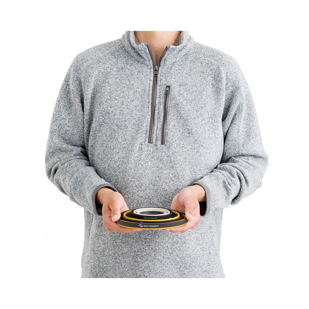 Zaprojektowany z myślą o maksymalnej oszczędności miejsca i funkcjonalności zestaw: duża miska, średnia miska oraz kubek składają się do kompaktowych rozmiarów, dzięki czemu zajmują minimalną przestrzeń w plecaku. Nowa, lekka konstrukcja sprawia, że cały zestaw niemal nie zwiększa wagi ekwipunku, a przy tym oferuje jeszcze większy komfort użytkowania. Każda miska została wyposażona w praktyczny rant, który zapewnia pewny chwyt, a delikatnie zaokrąglone dno idealnie współgra ze sztućcami Sea to Summit. Kubek posiada dodatkowy uchwyt w postaci wewnętrznego pierścienia, ułatwiającego trzymanie gorących napojów. Jak przystało na markę, która jako pierwsza wprowadziła składane naczynia na biwak, produkt wykonano z najwyższej jakości materiałów, zgodnych z europejskimi normami bezpieczeństwa żywności.